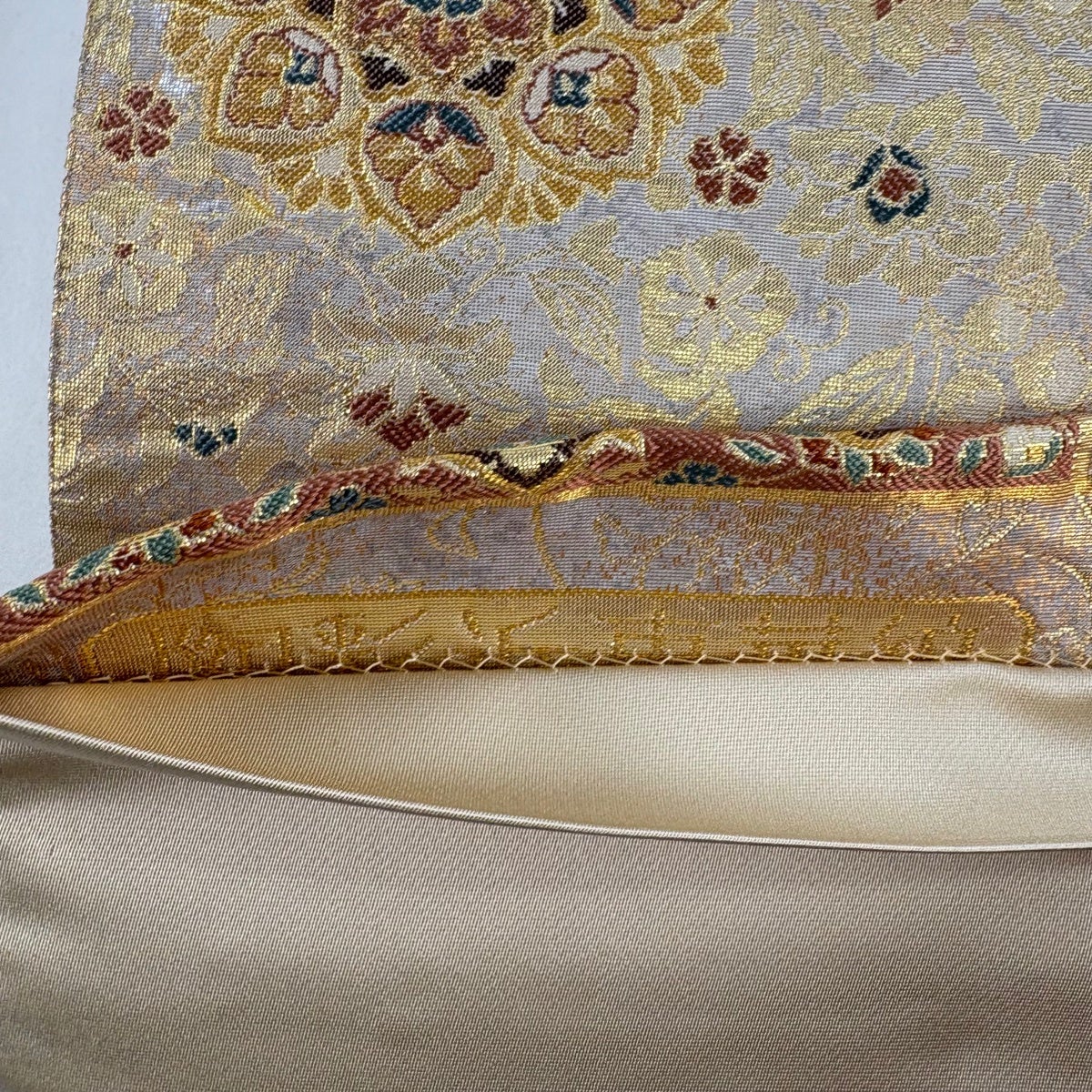 【美品】 袋帯 秀品 草花 金彩 灰色 全通 正絹