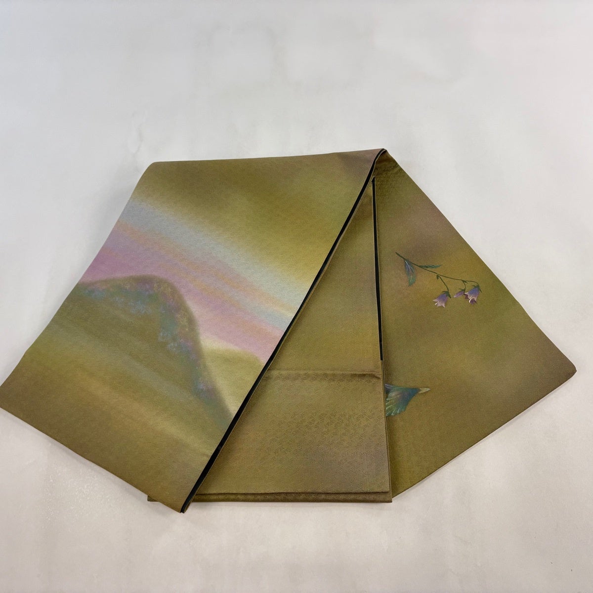 袋帯 名品 草花 蝶 金糸 箔 青緑 六通 正絹