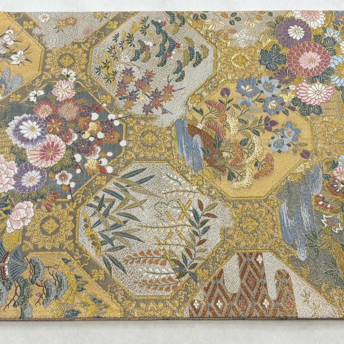 【美品】 袋帯 秀品 夏帯 菱 草花 金銀糸 箔 ベージュ お太鼓柄 正絹