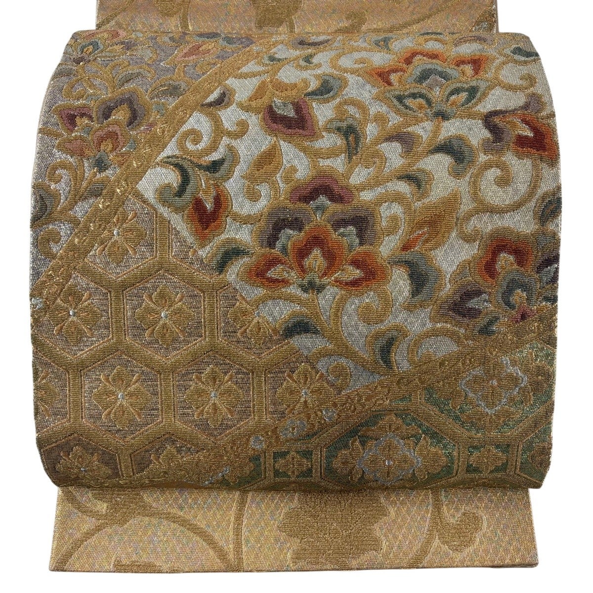 【美品】 袋帯 秀品 鈴乃屋 華文 花唐草 金糸 箔 金色 六通 正絹