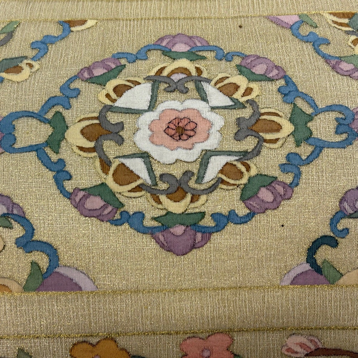 【美品】 袋帯 秀品 関西仕立て 菊 青海波 唐織 箔 ベージュ 六通 正絹