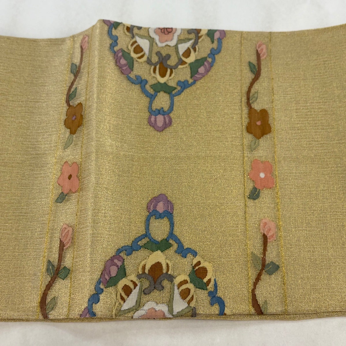 袋帯 秀品 夏帯 紗 雪輪 草花 金糸 刺繍 ピンクベージュ 六通 正絹