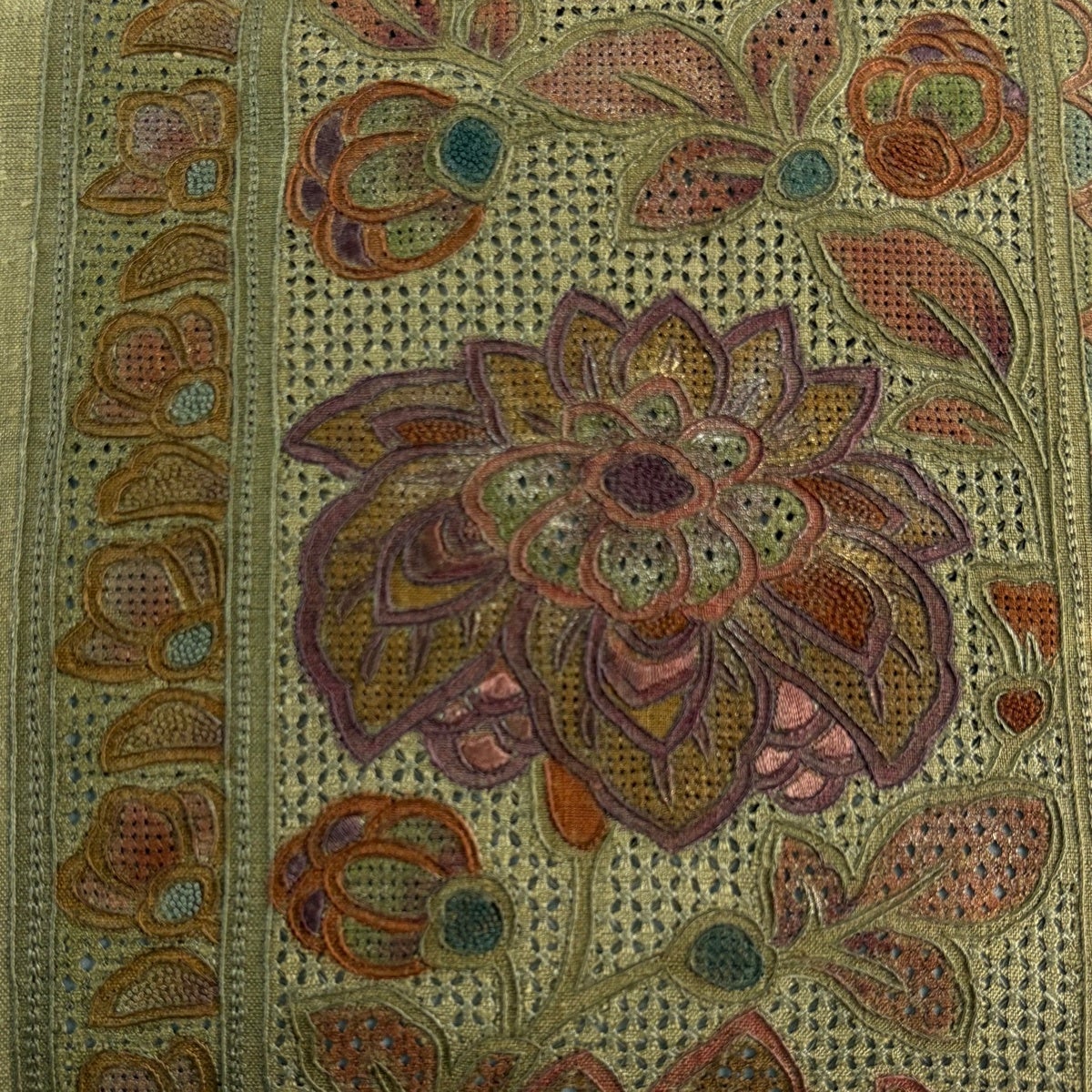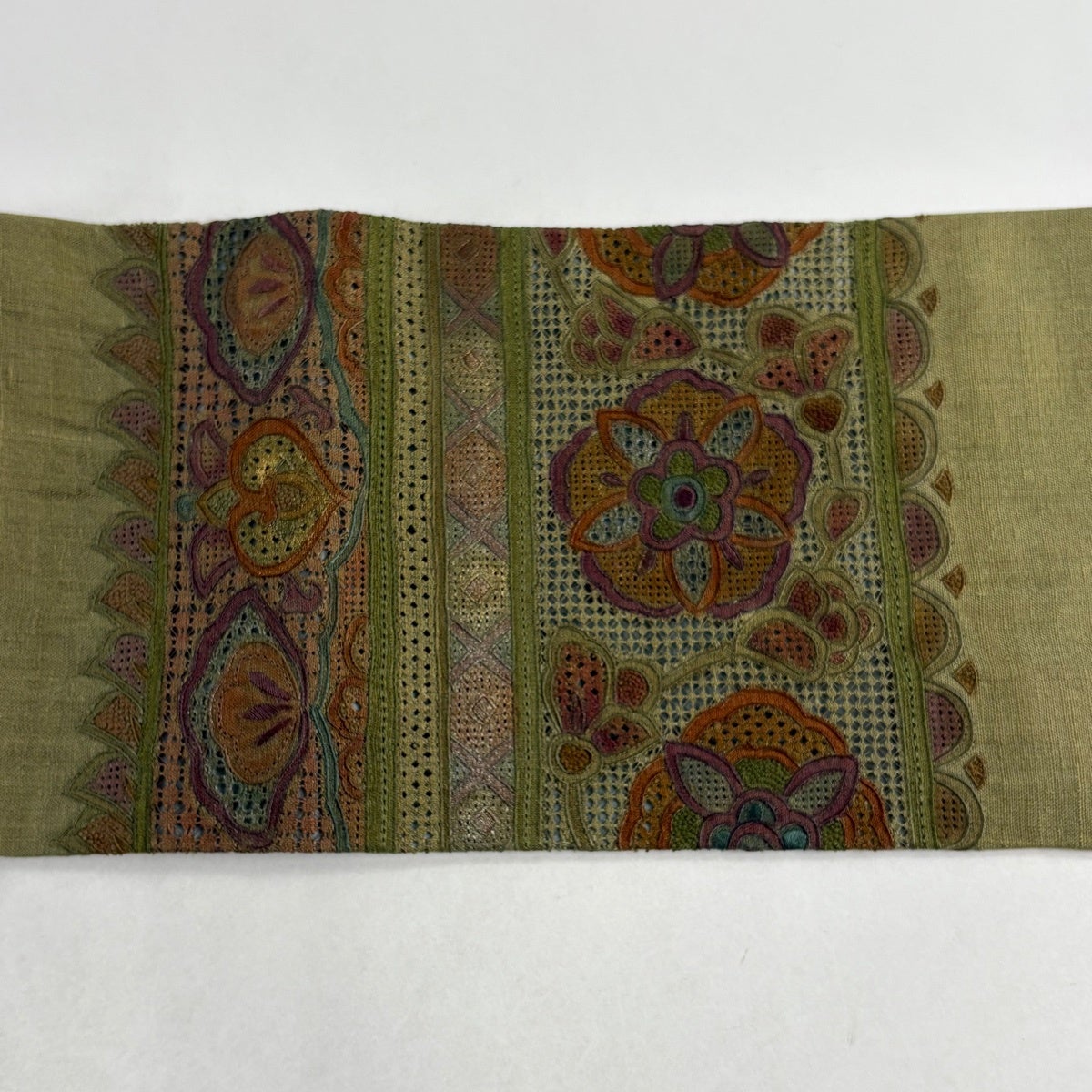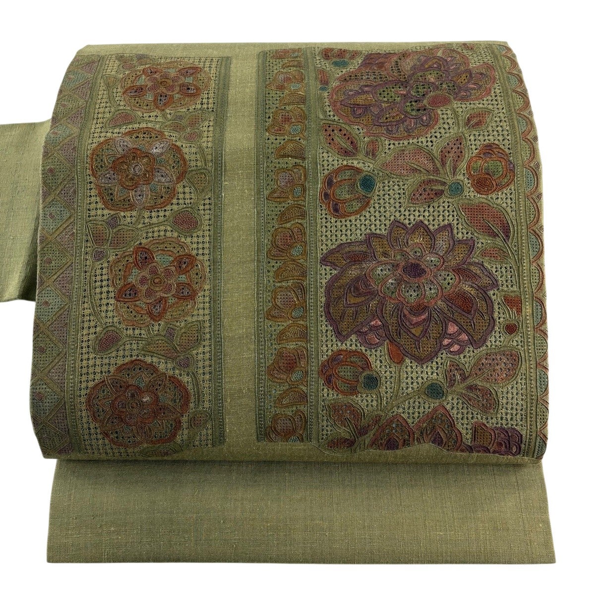 名古屋帯 逸品 花菱 花柄 刺繍 薄黄土色 正絹