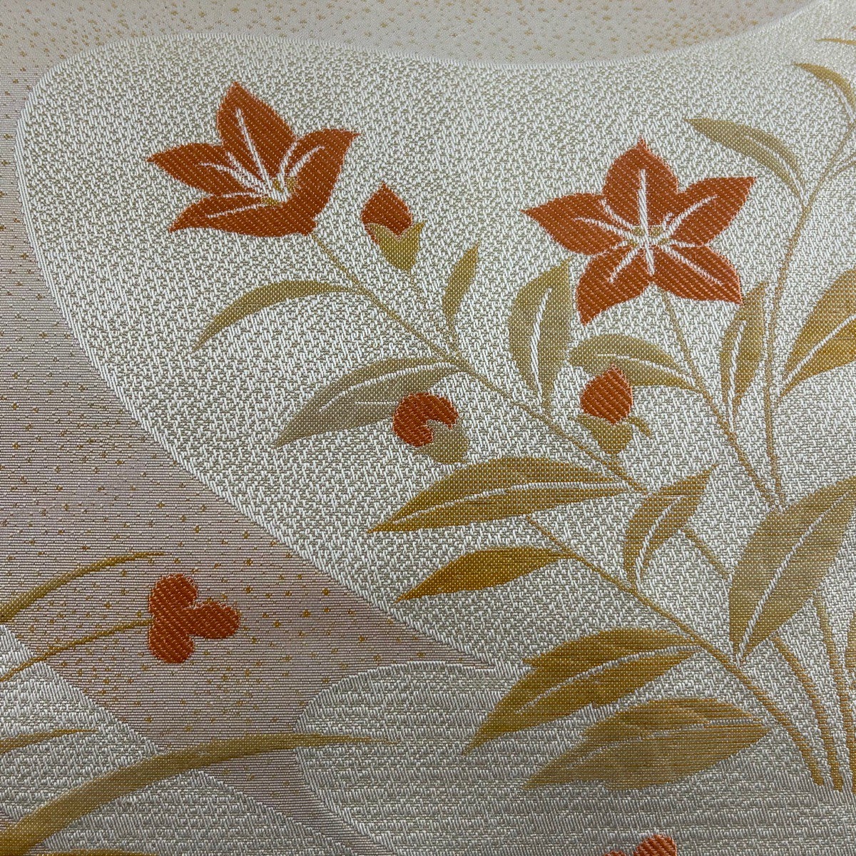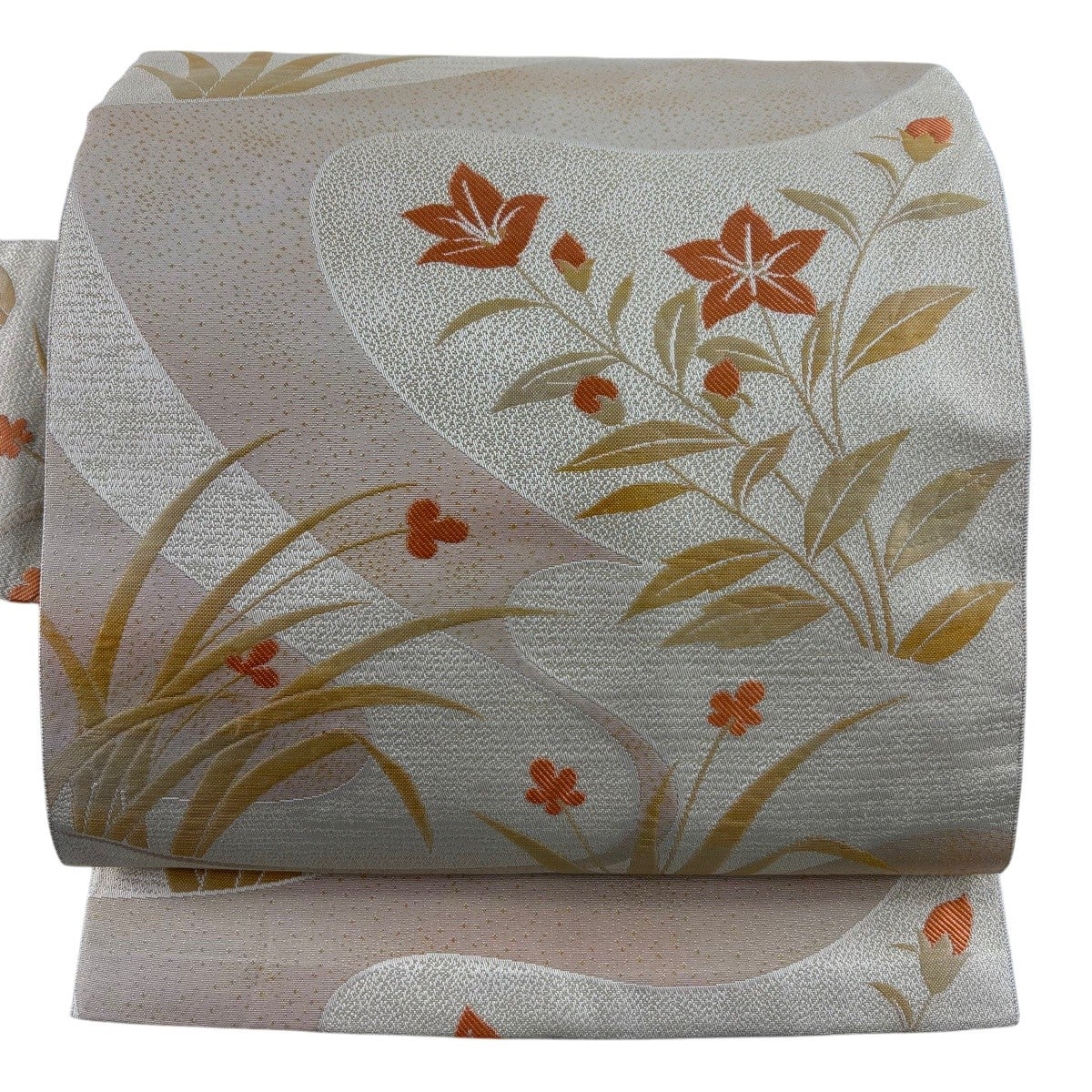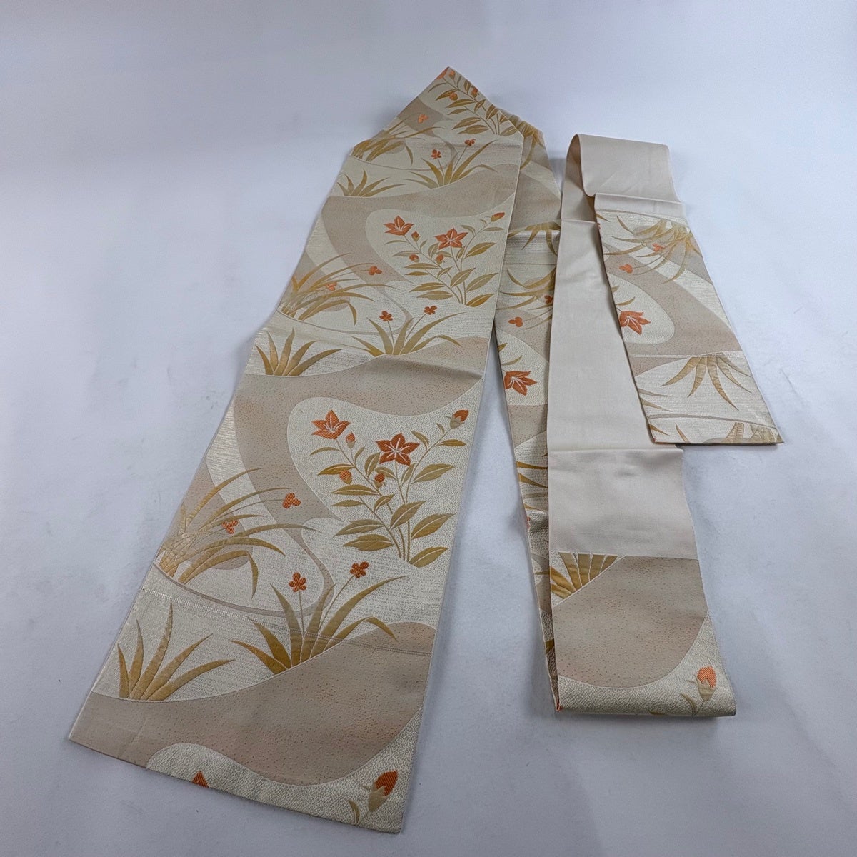 【美品】 名古屋帯 秀品 落款あり 秋草 金彩 クリーム 正絹