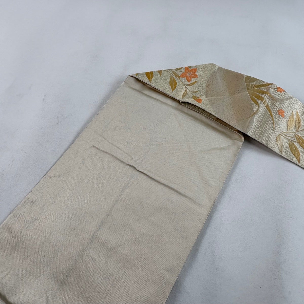 【美品】 名古屋帯 秀品 夏帯 絽 八寸名古屋帯 松葉仕立て 草花 金糸 ベージュ 正絹