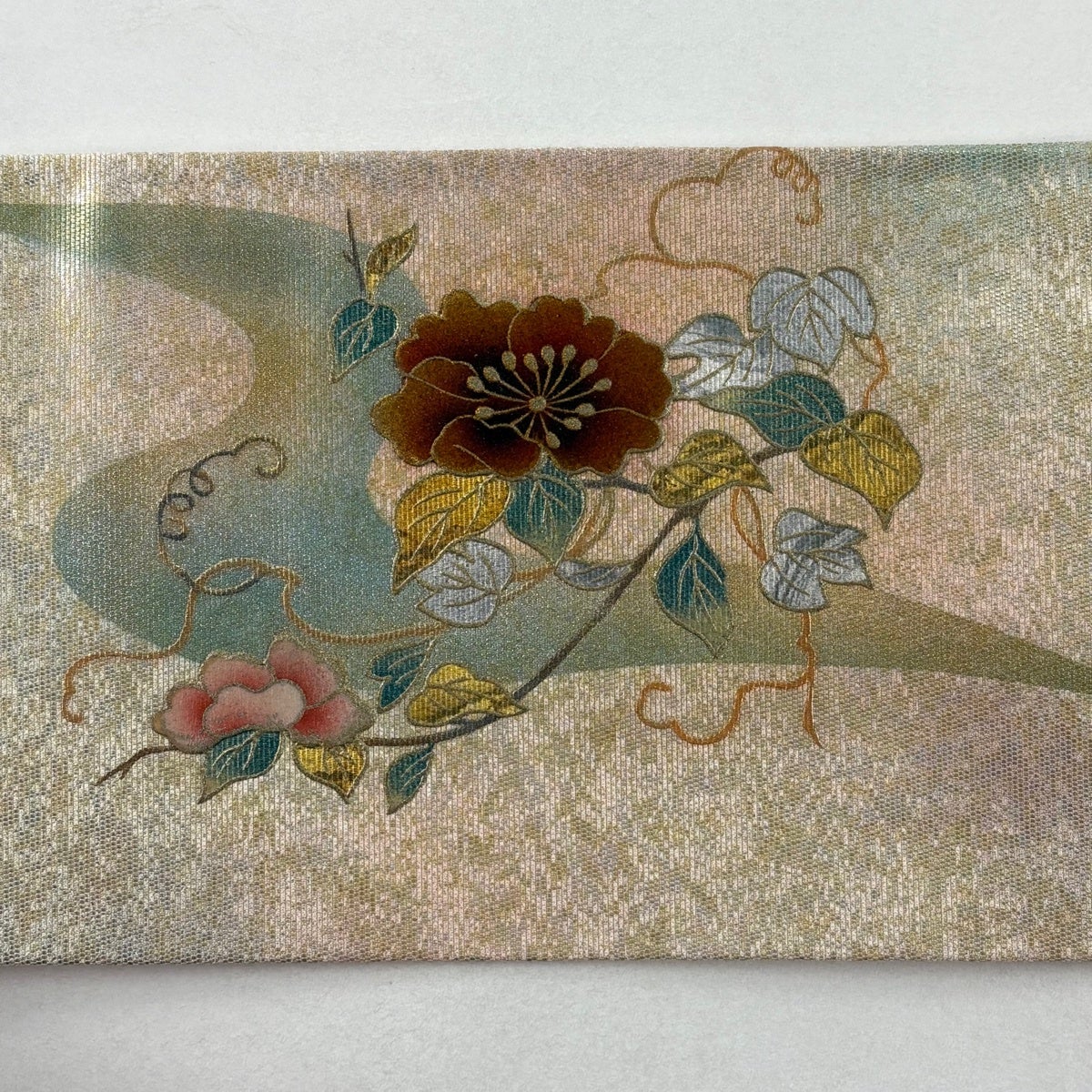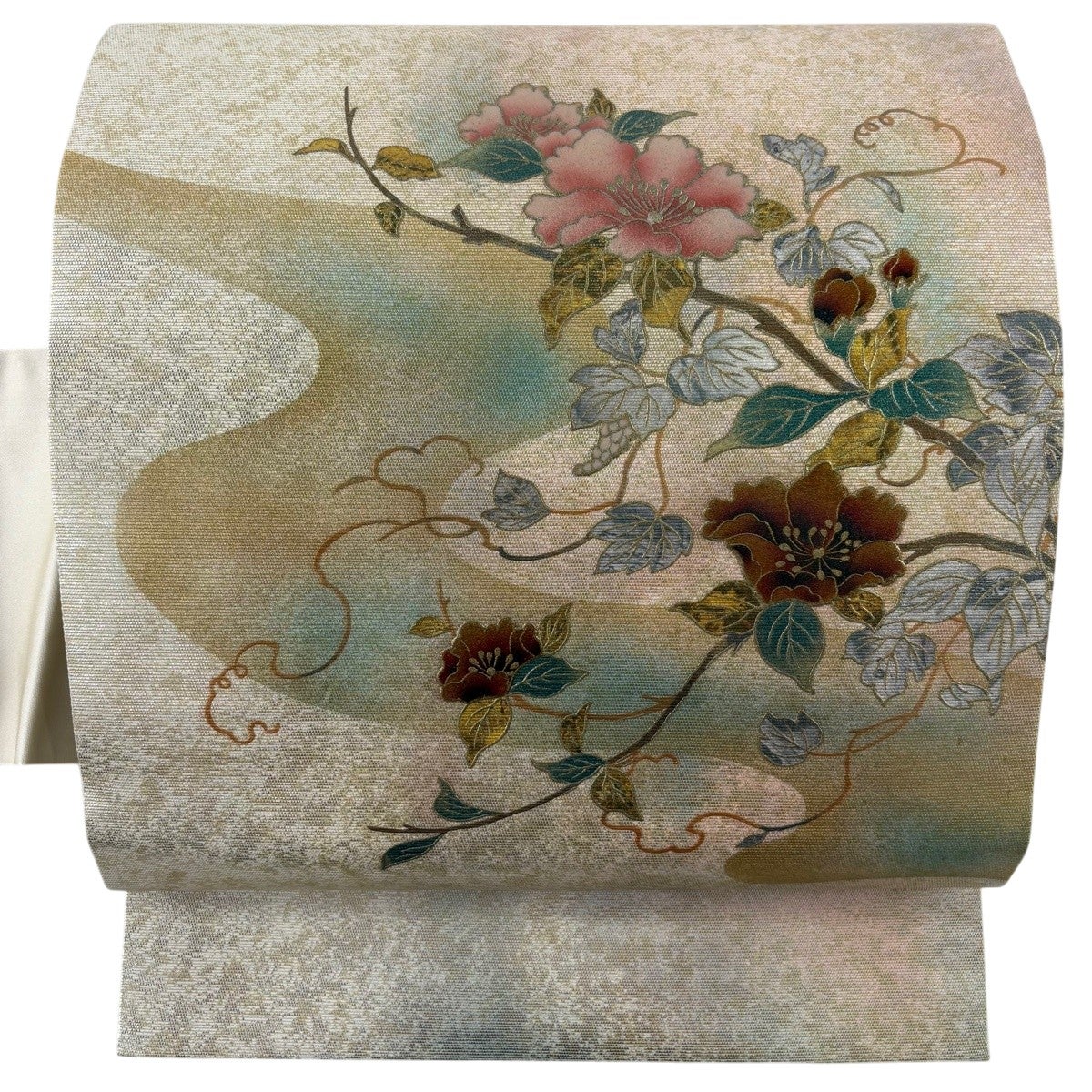 名古屋帯 優品 落款あり 枝花 金彩 ベージュ 正絹