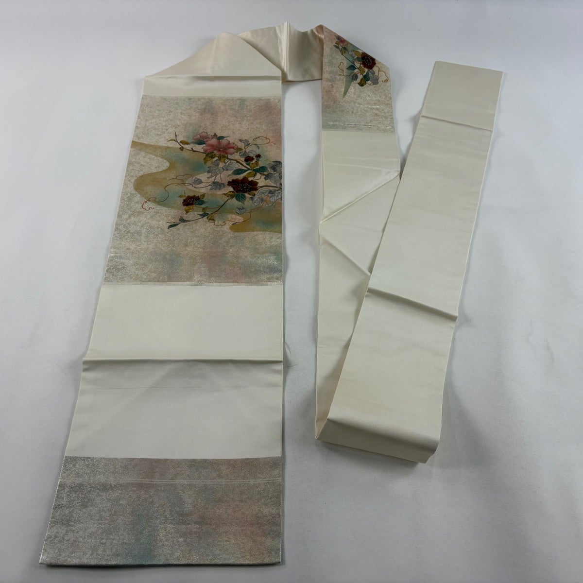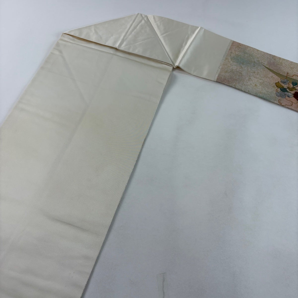 名古屋帯 優品 関西仕立て 扇 草花 銀糸 箔 クリーム 正絹