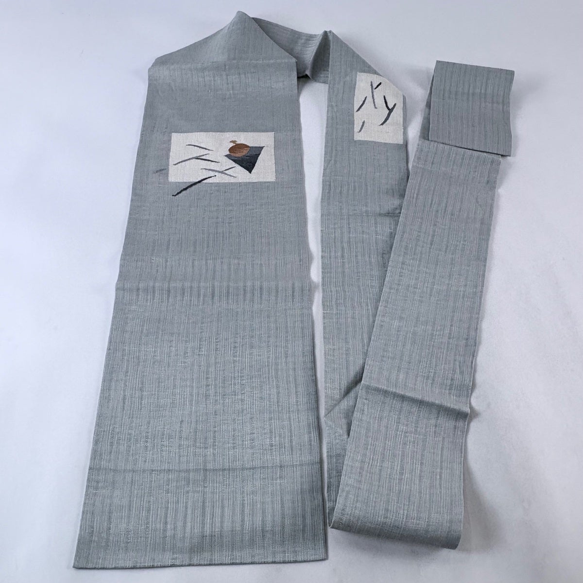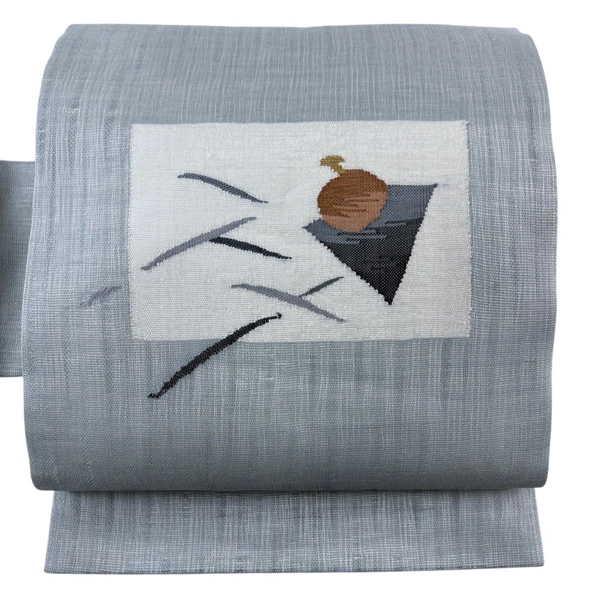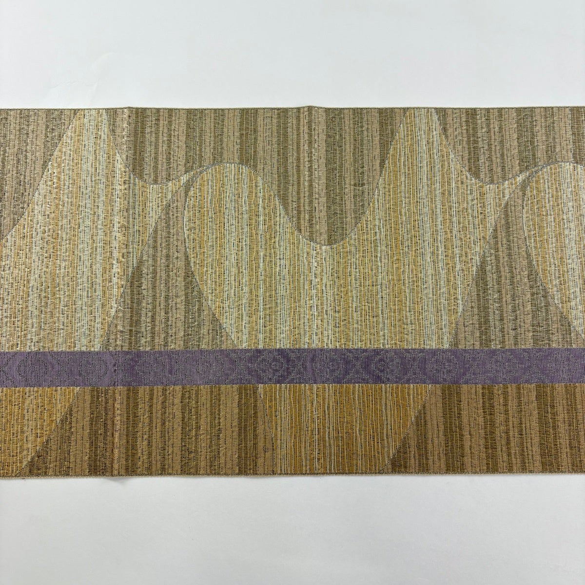 名古屋帯 秀品 夏帯 幾何学模様 金糸 灰緑 正絹
