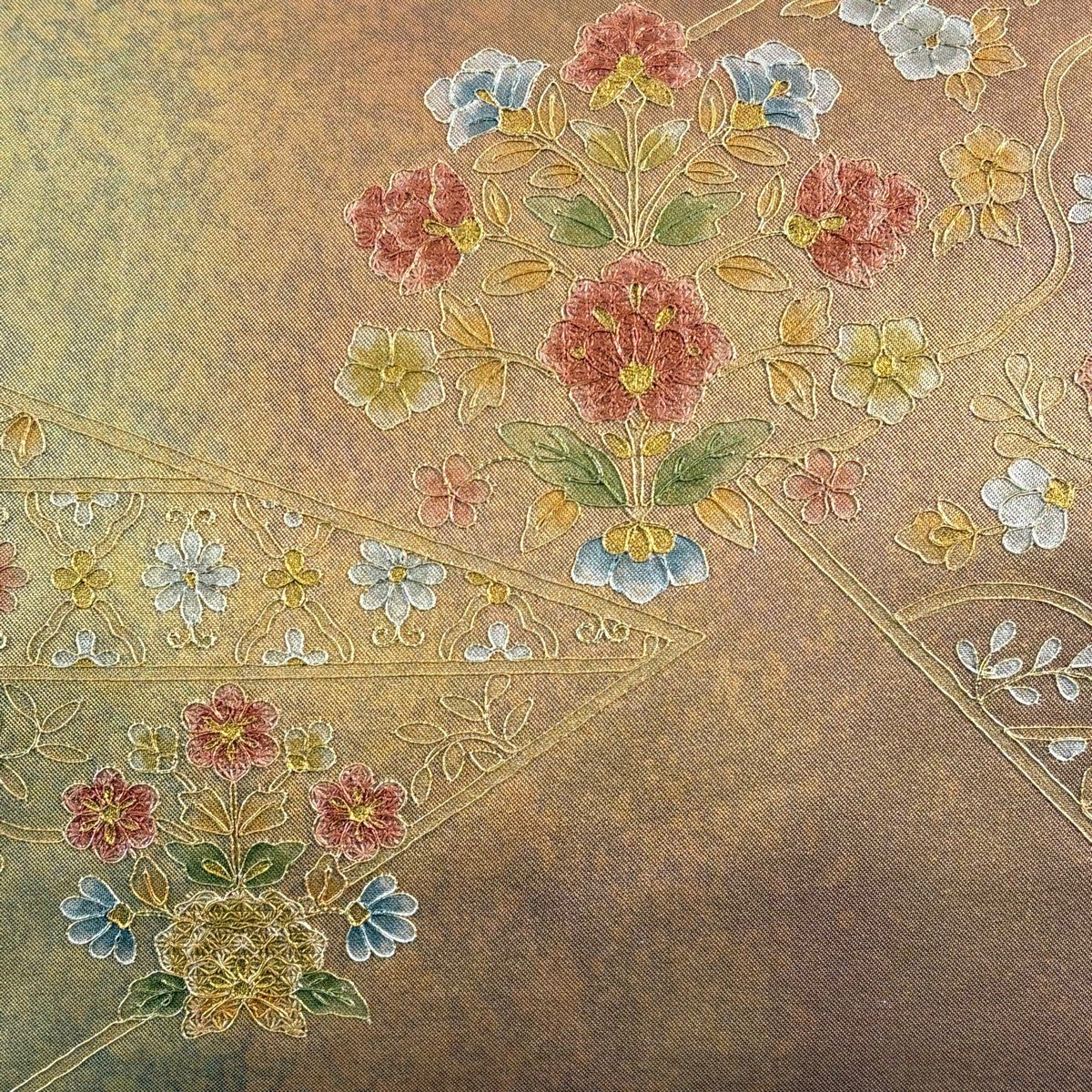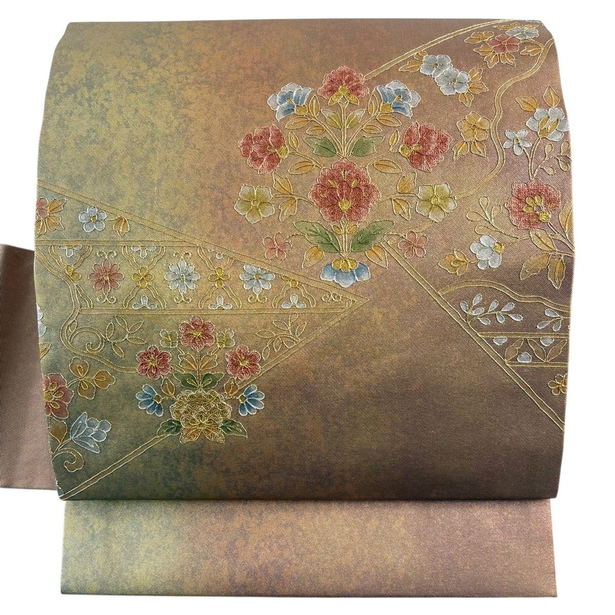 50%OFF 【美品】 開き名古屋帯 秀品 やまと 華文 草花 切り嵌め 箔 ベージュ 正絹 K50