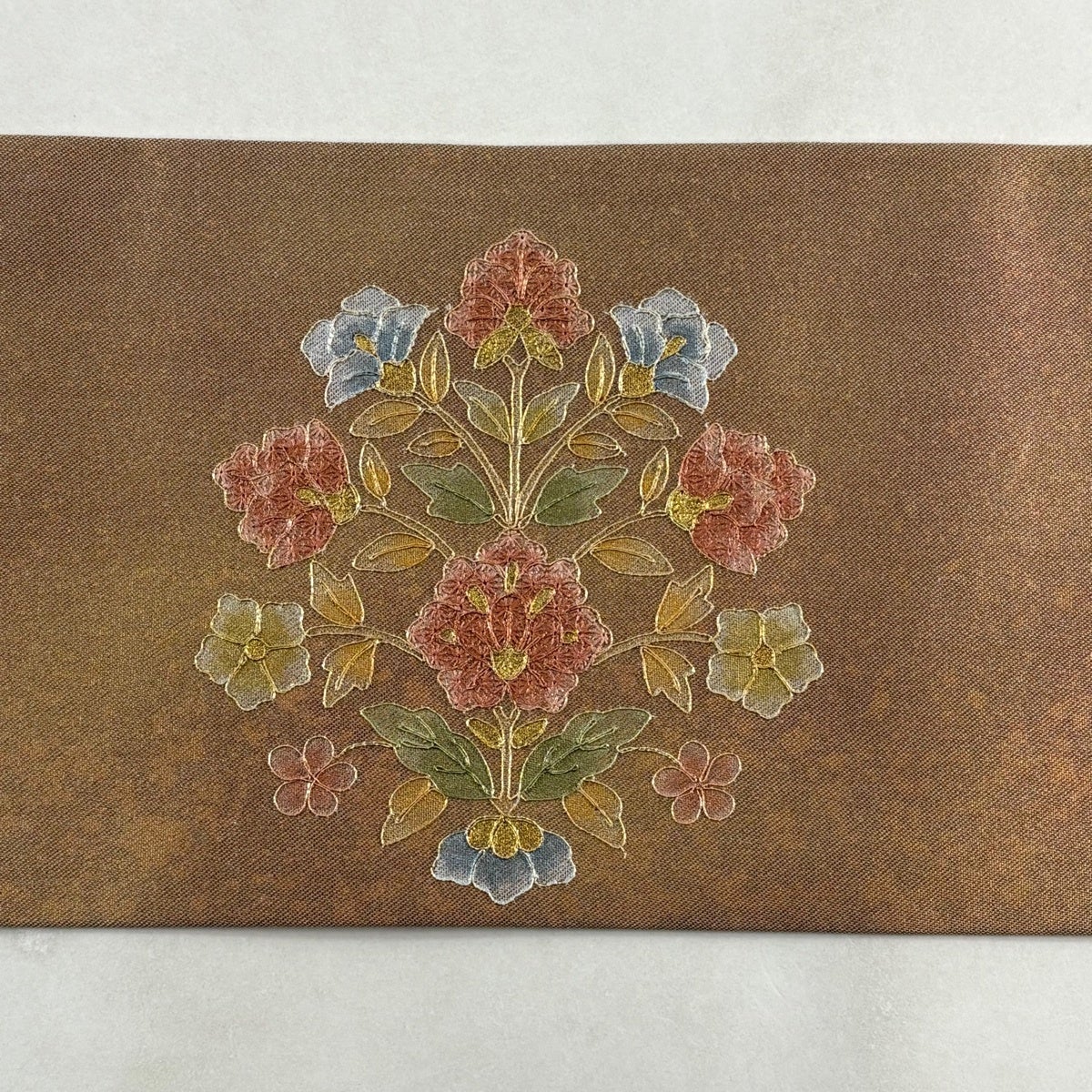 名古屋帯 秀品 紬地 草花 相良刺繍 灰茶 正絹