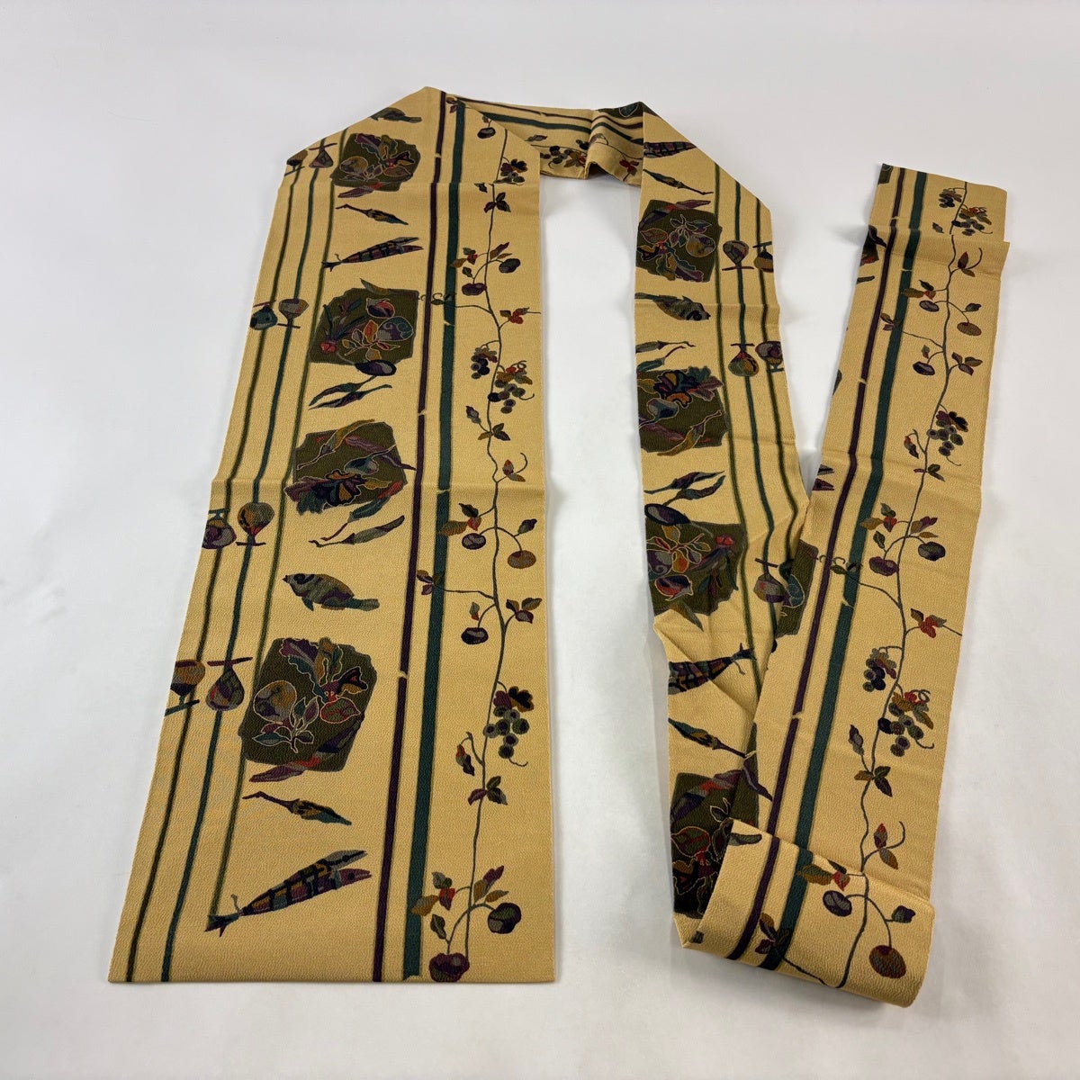 【美品】 名古屋帯 名品 花鳥 動物 刺繍 薄黄土色 正絹