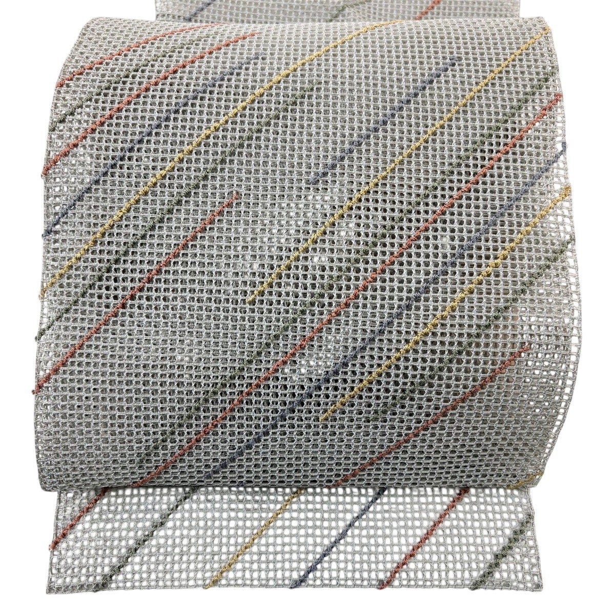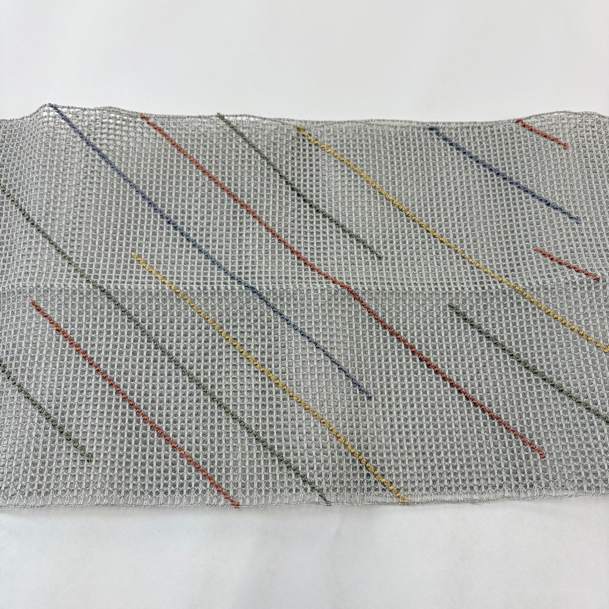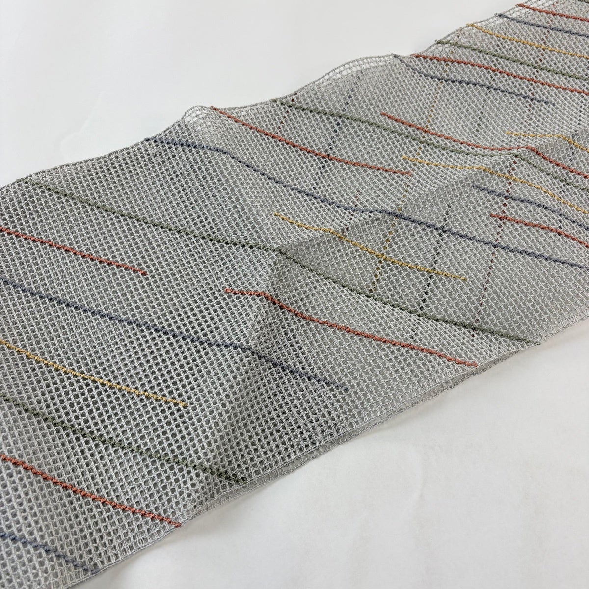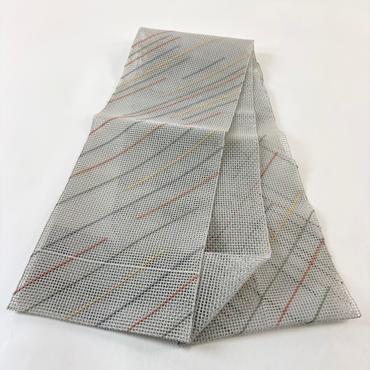 名古屋帯 秀品 夏帯 八寸名古屋帯 松葉仕立て トンネル仕立て 斜縞 灰色 正絹