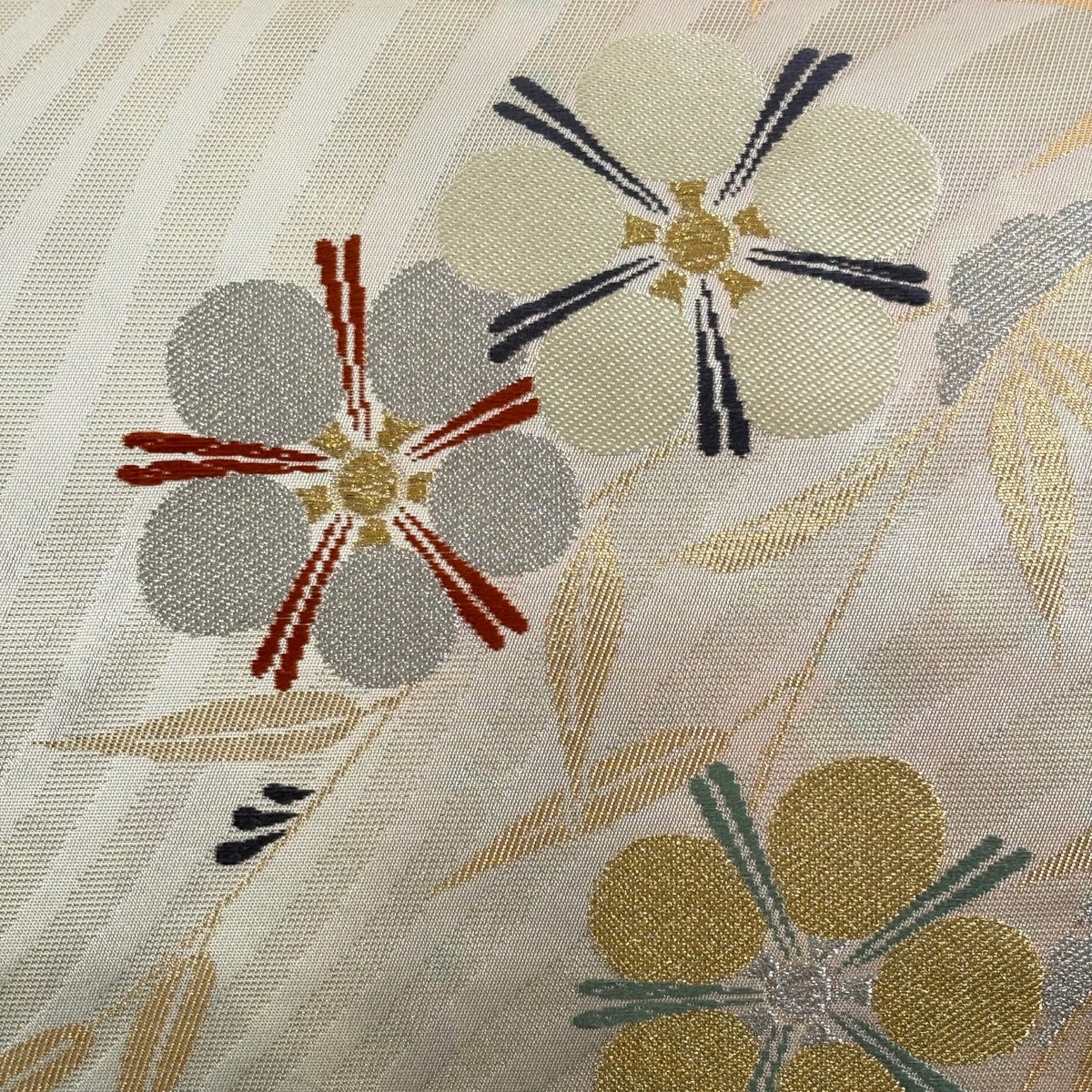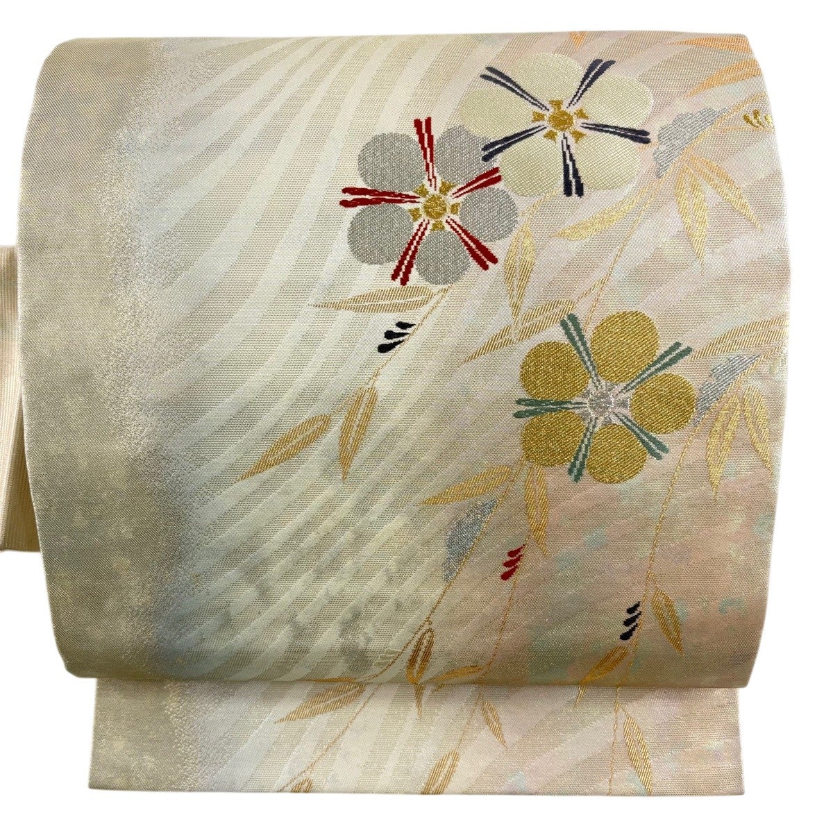 【美品】 名古屋帯 秀品 梅 葉 金銀糸 箔 ベージュ 正絹