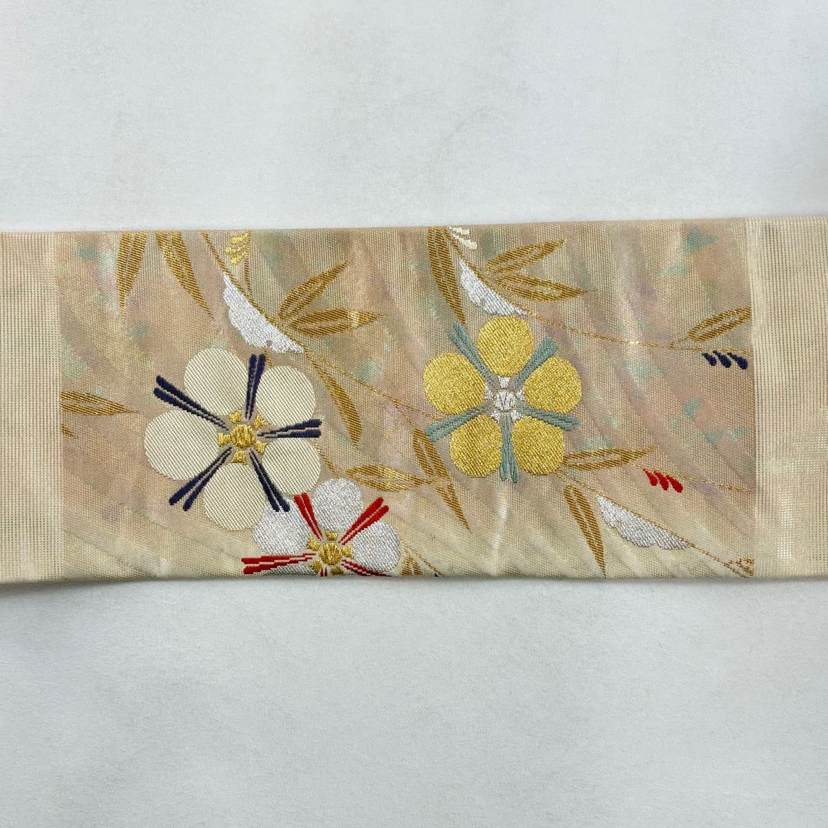 名古屋帯 秀品 草花 幾何学模様 縮緬 ピンクベージュ 正絹