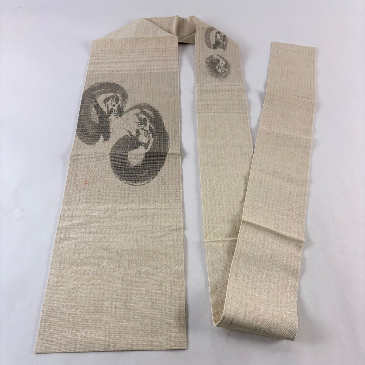 名古屋帯 逸品 落款あり 鳥獣戯画 縮緬 薄緑 正絹