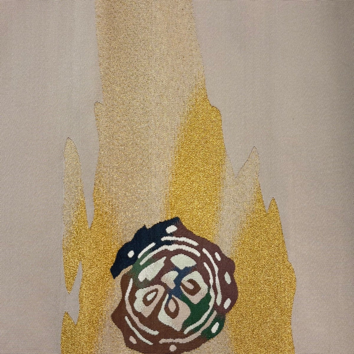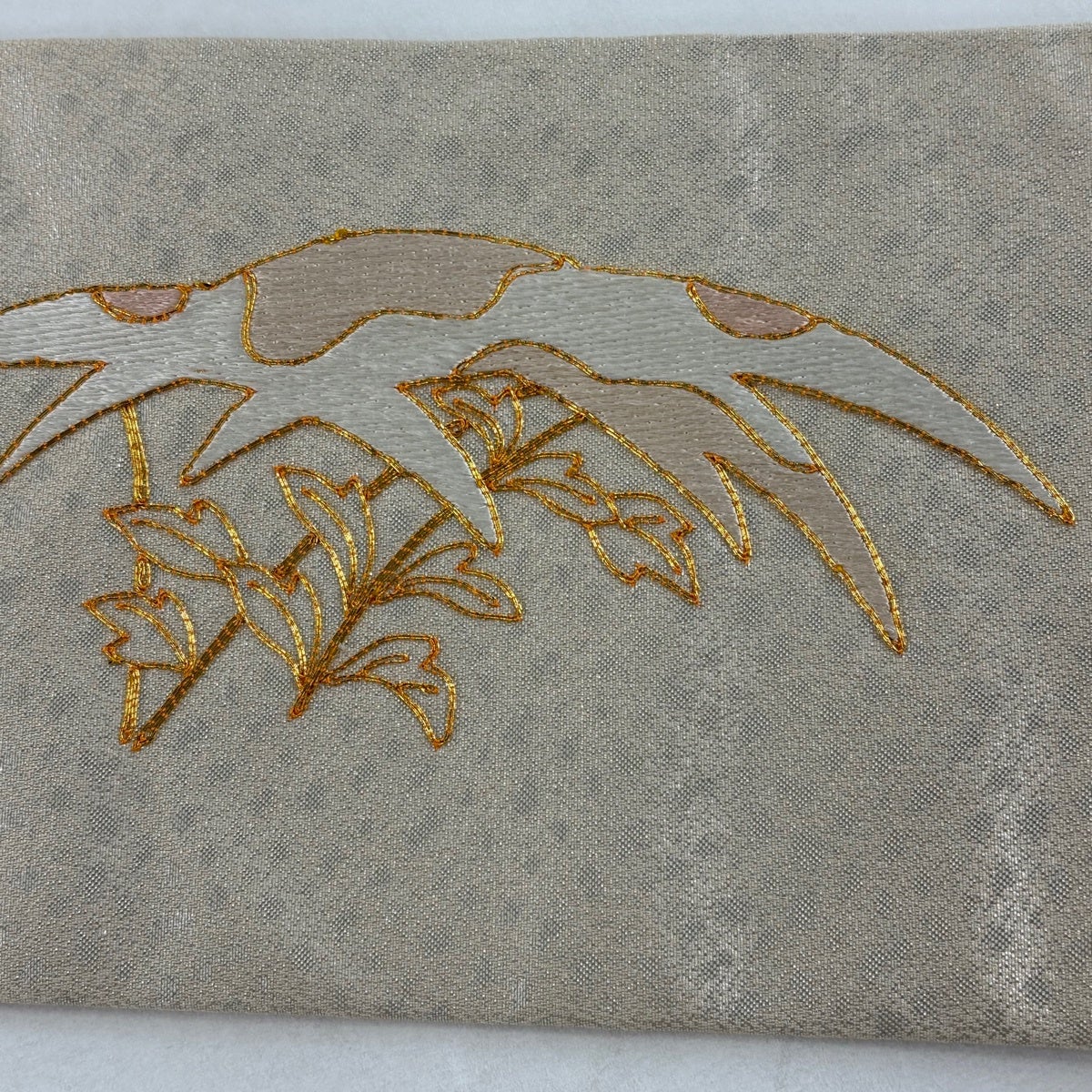 【美品】 名古屋帯 秀品 紬地 草花 刺繍 金糸 薄黄土色 正絹
