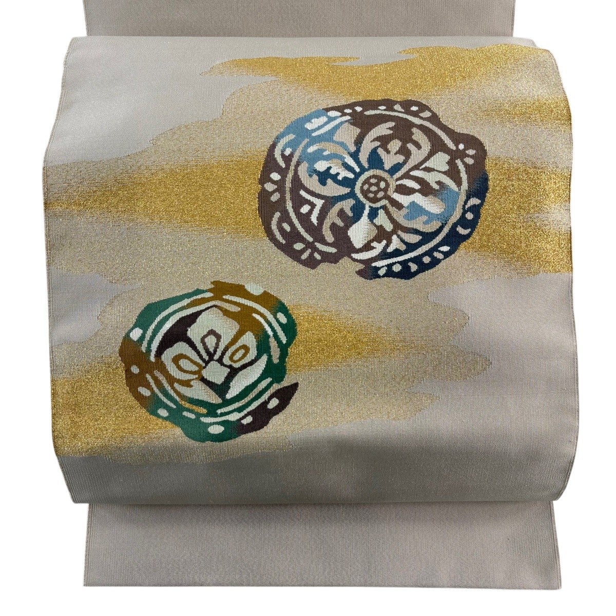 名古屋帯 名品 八寸名古屋帯 夏帯 牡丹 芝 金銀糸 ベージュ 正絹