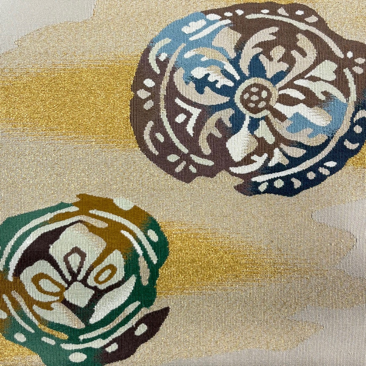 【美品】 名古屋帯 秀品 狩猟文 花鳥 金糸 箔 青緑 正絹