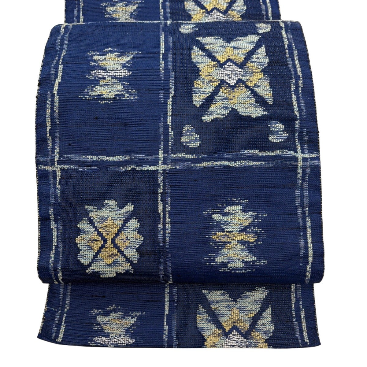 【美品】 名古屋帯 逸品 証紙あり 八寸名古屋帯 松葉仕立て 博多織 縞 幾何学模様 紺色 正絹