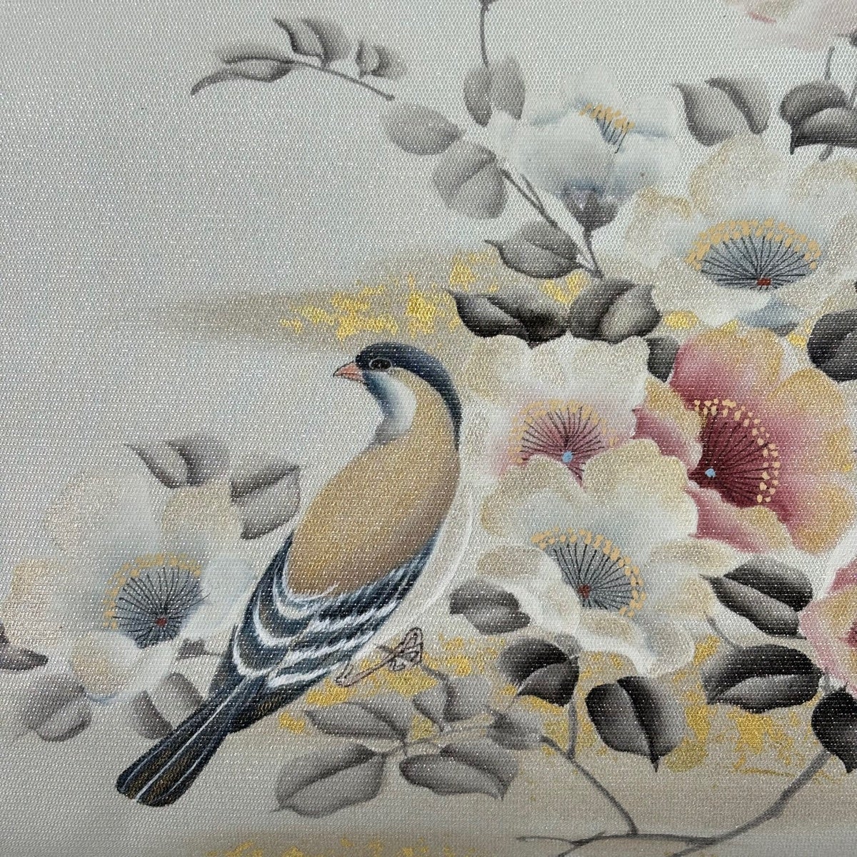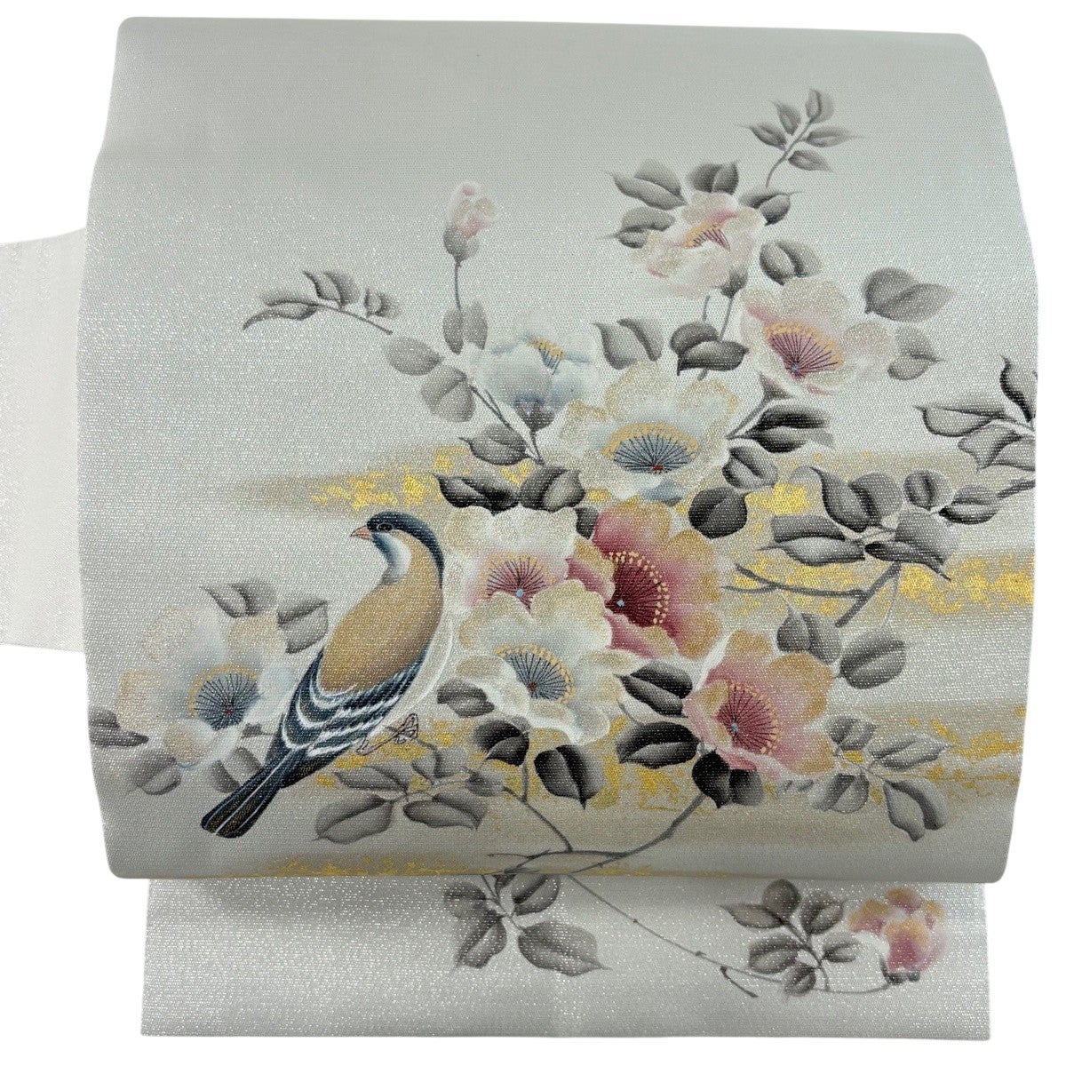 【美品】 名古屋帯 秀品 花鳥 霞 金彩 銀通し 灰緑 正絹