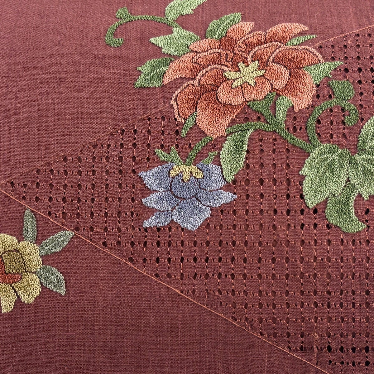 【美品】 名古屋帯 秀品 草花 刺繍 えんじ色 正絹