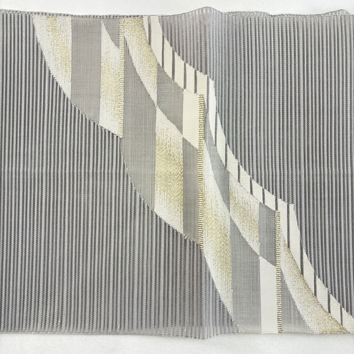 【美品】 名古屋帯 優品 夏帯 幾何学模様 縞 金糸 ベージュ 正絹
