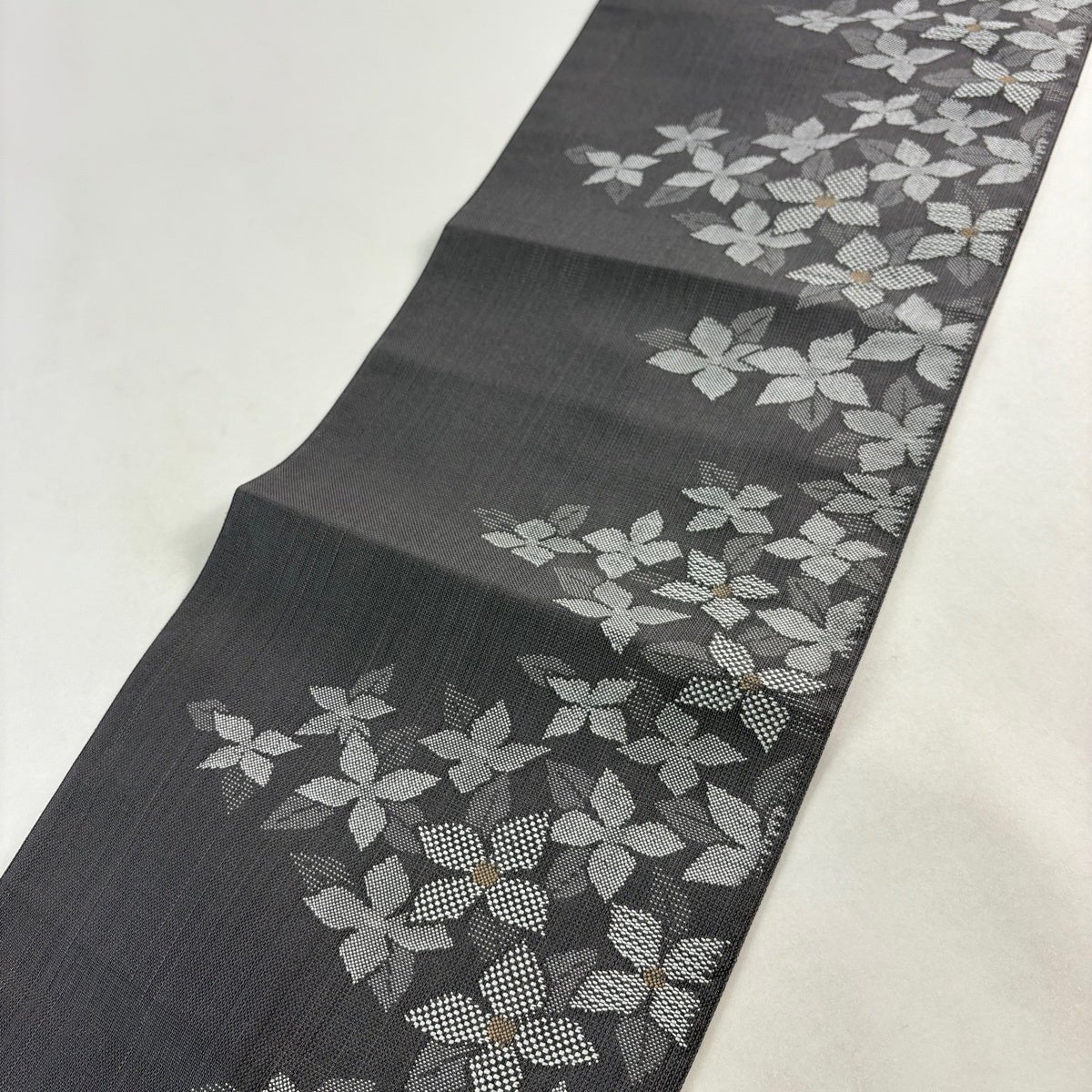 【美品】半幅帯 優品 桜 幾何学 灰茶 化繊