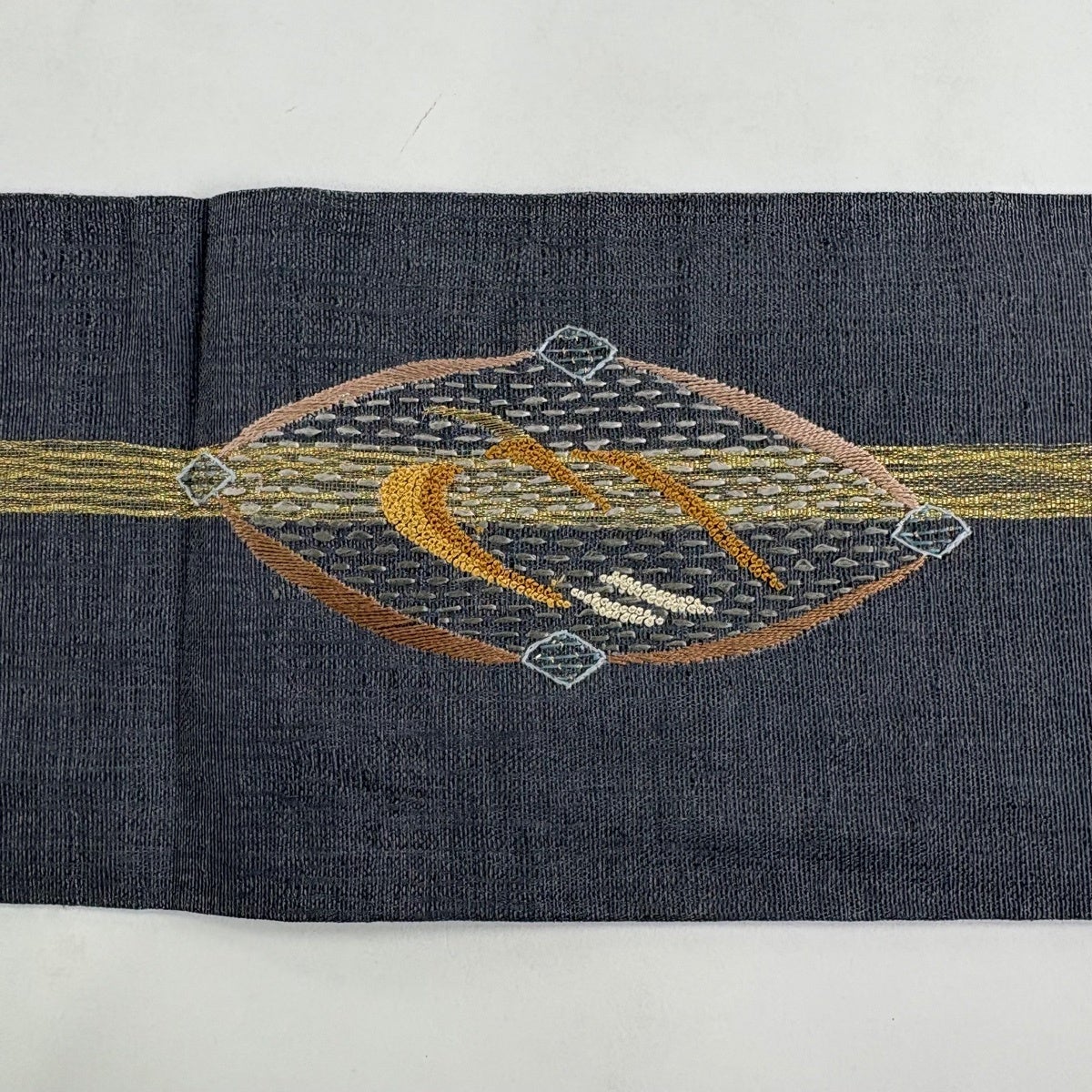 半幅帯 優品 荒磯 花唐草 黒灰 化繊