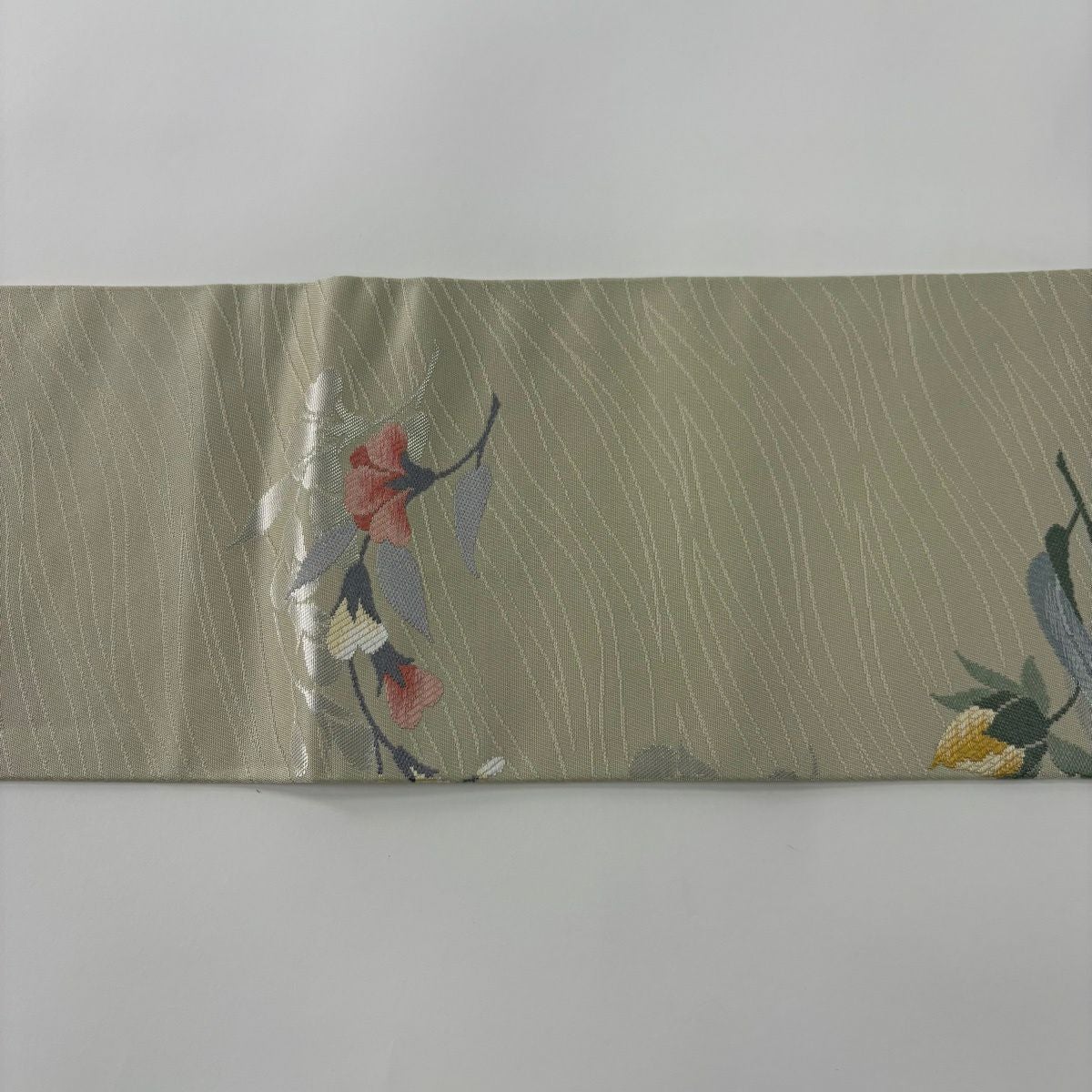 【美品】 名古屋帯 秀品 夏帯 絽 八寸名古屋帯 草花 流水 金銀糸 薄緑 お太鼓柄 正絹