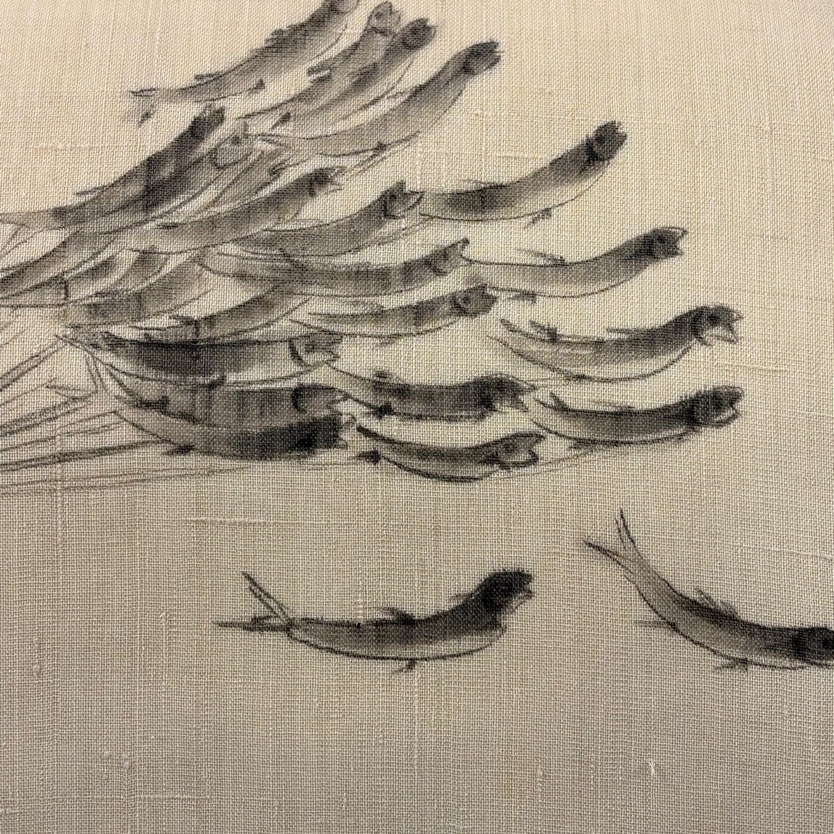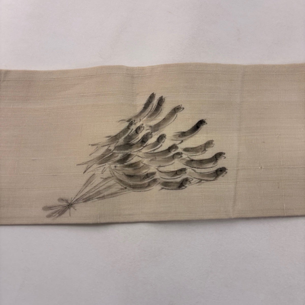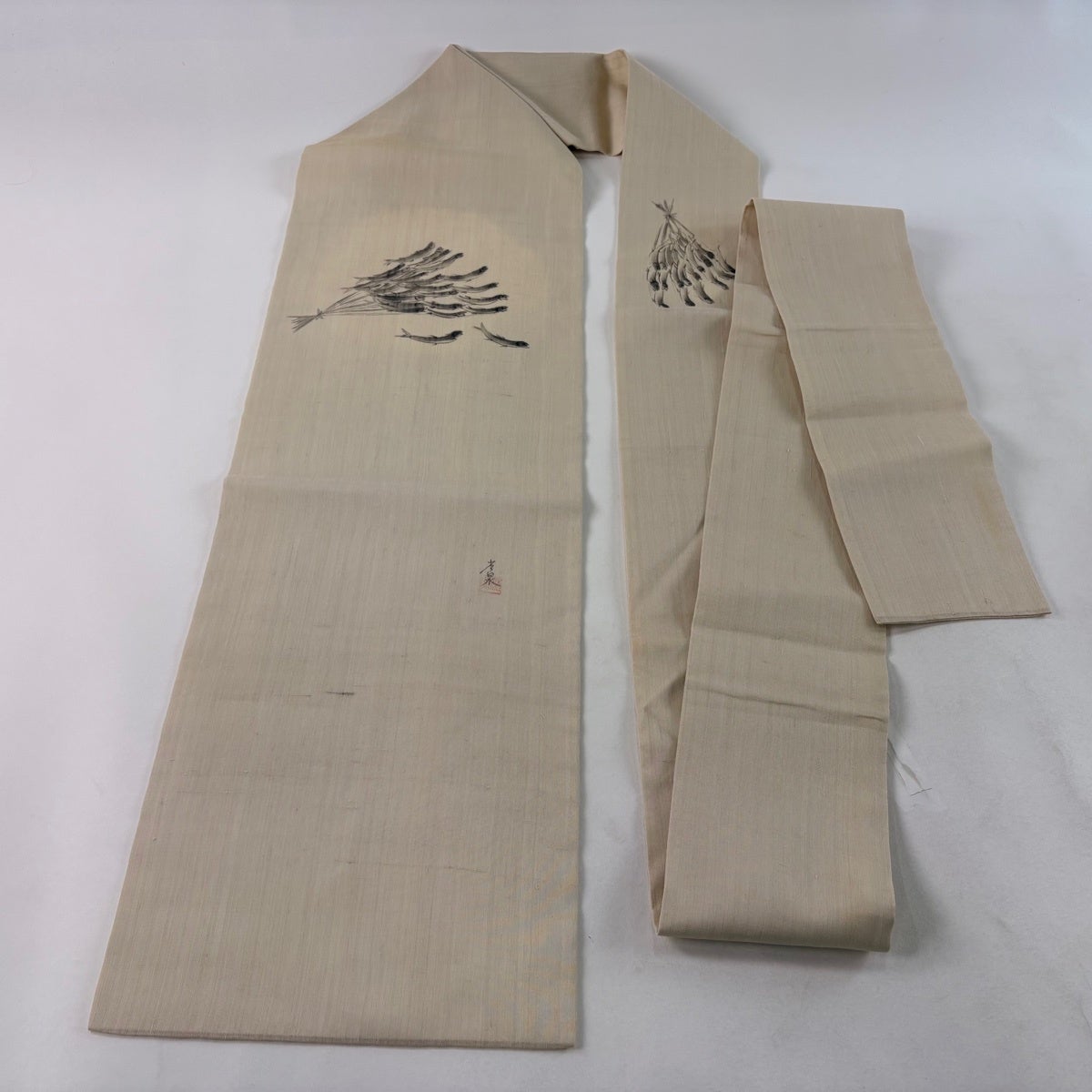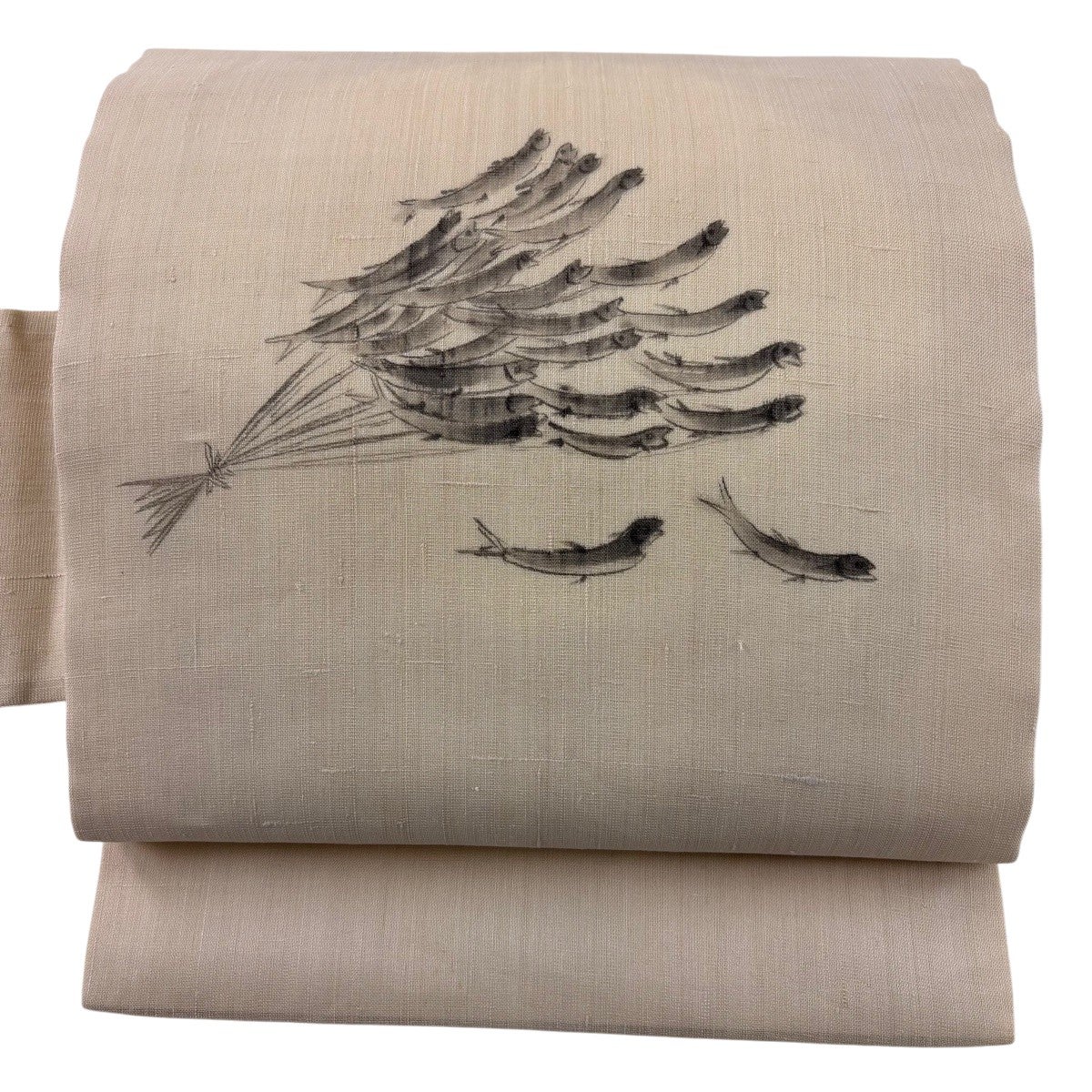 名古屋帯 秀品 落款あり 夏帯 夏紬地 魚 ベージュ 正絹