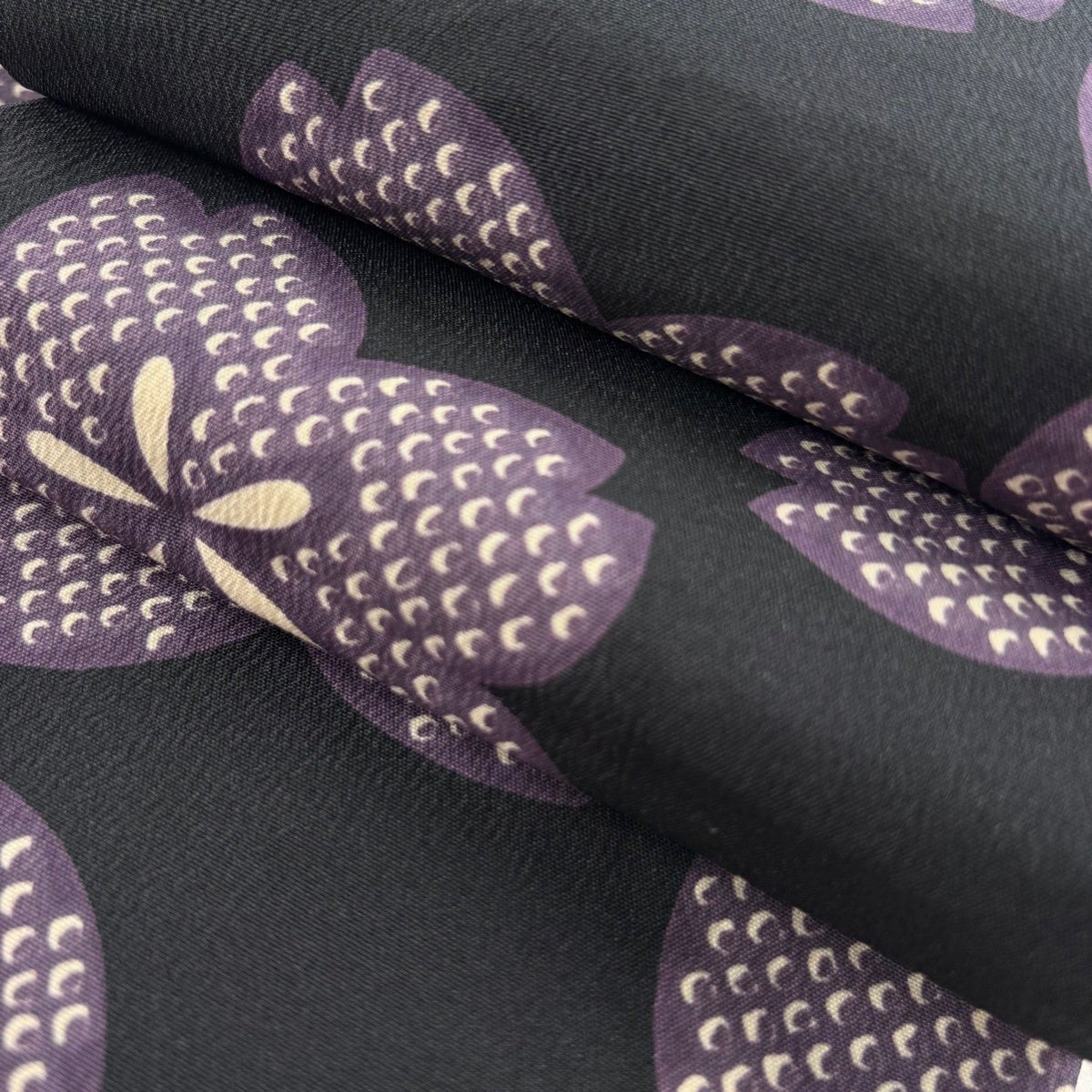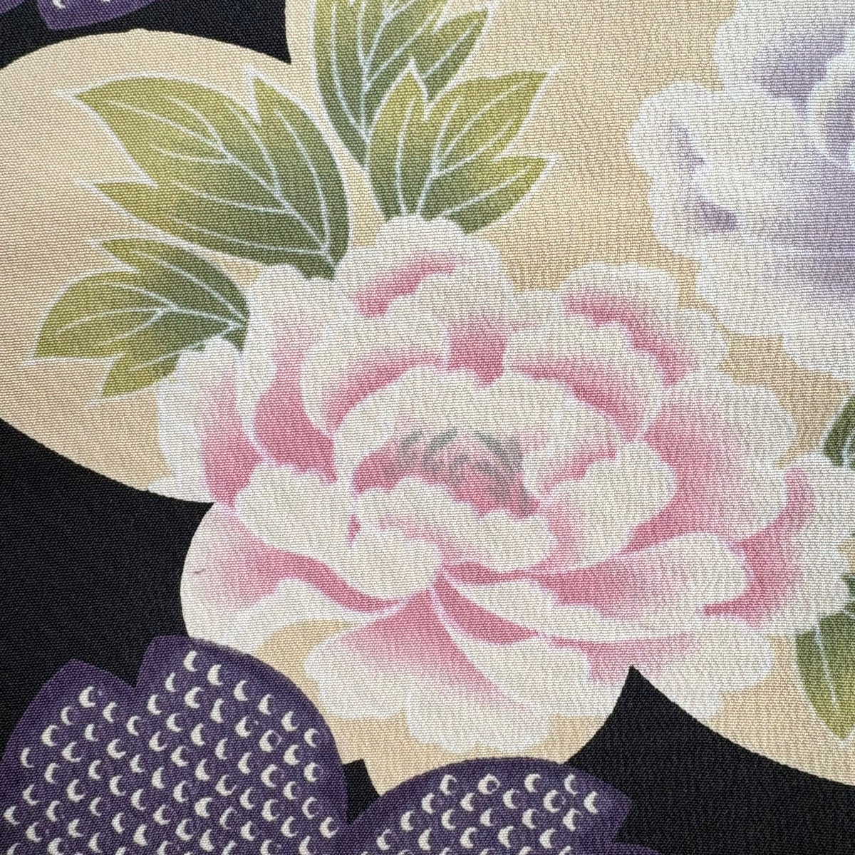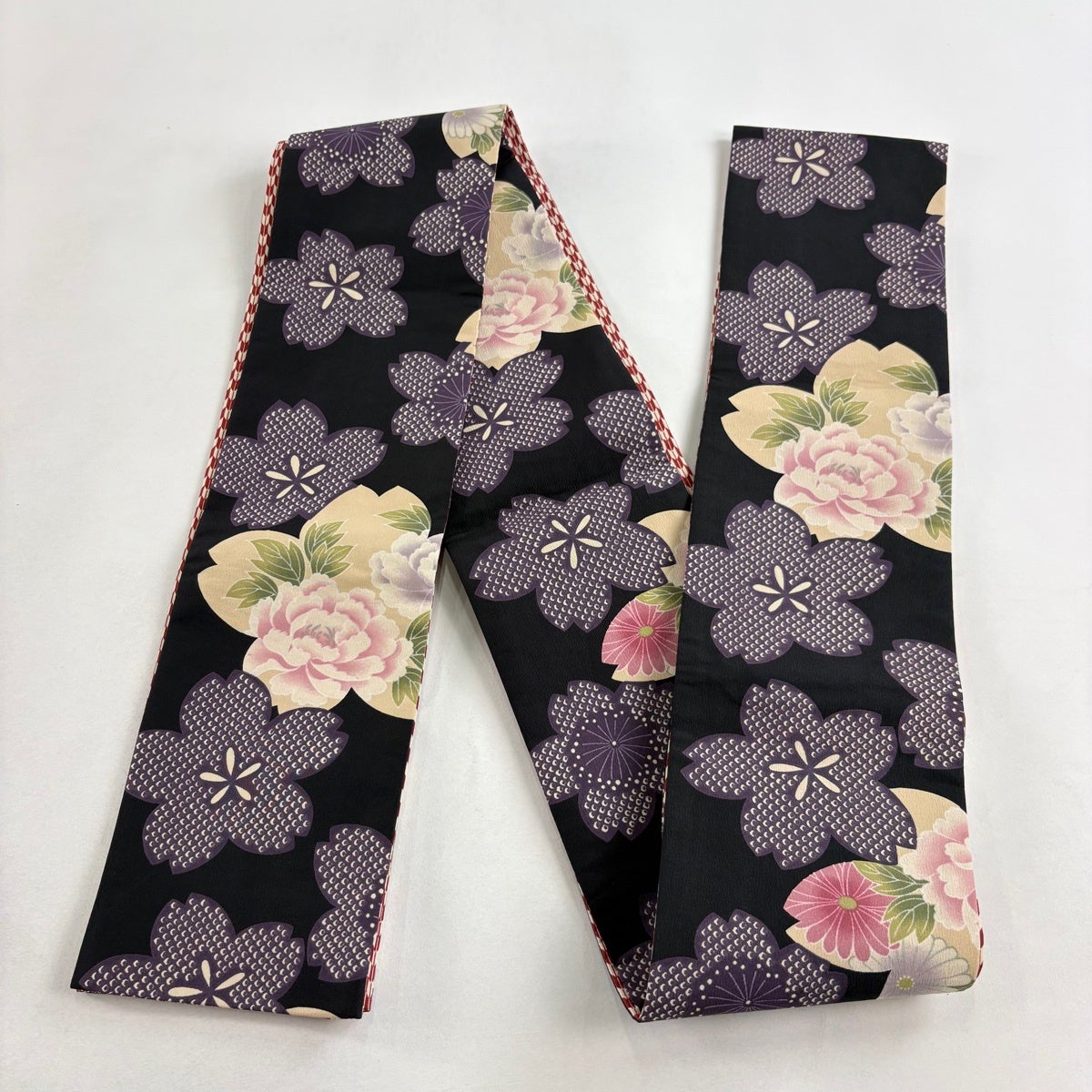 【美品】半幅帯 優品 桜 牡丹 墨色 化繊