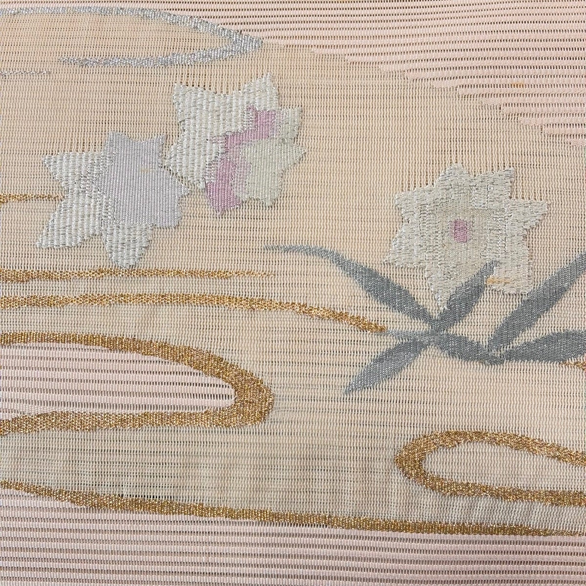 【美品】 名古屋帯 秀品 夏帯 絽 八寸名古屋帯 幾何学模様 草花 金銀糸 ベージュ 正絹
