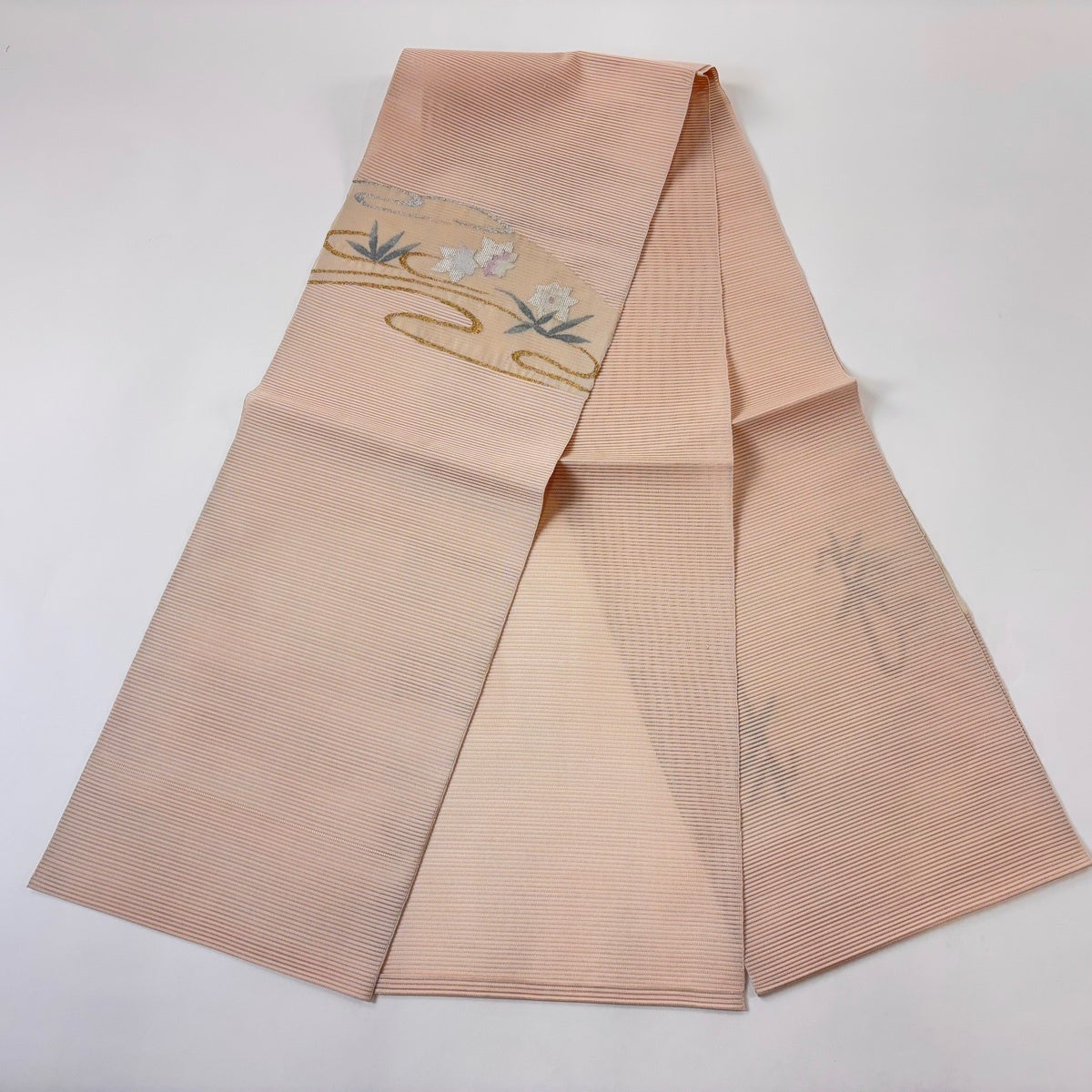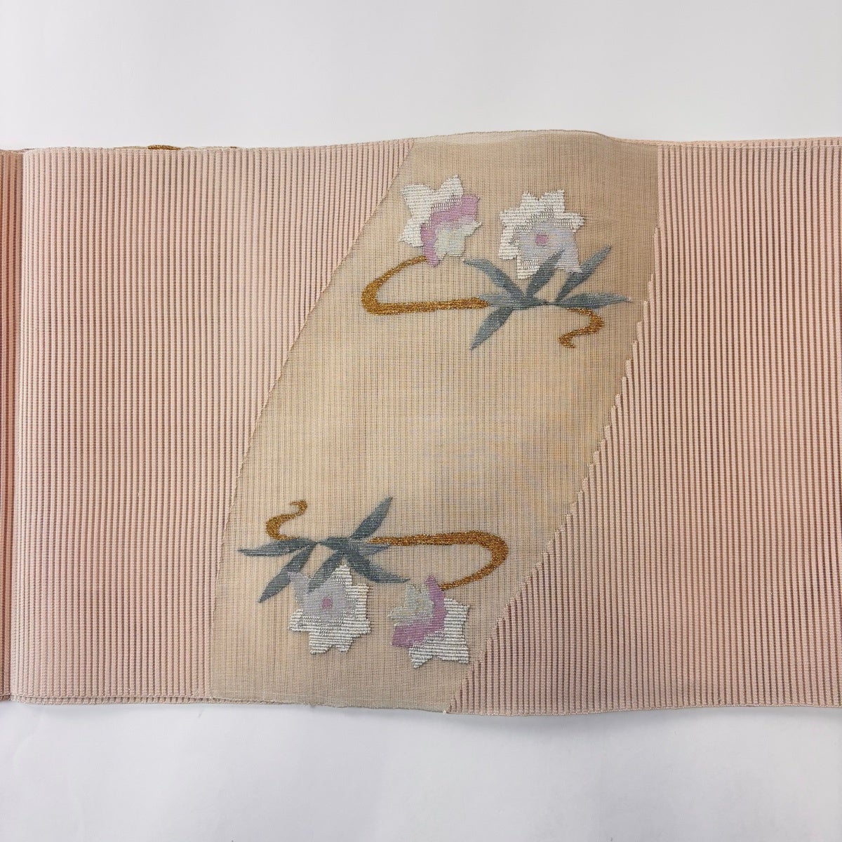 【在庫一掃】 【美品】半幅帯 優品 夏音 リボン 箔 ピンク 化繊