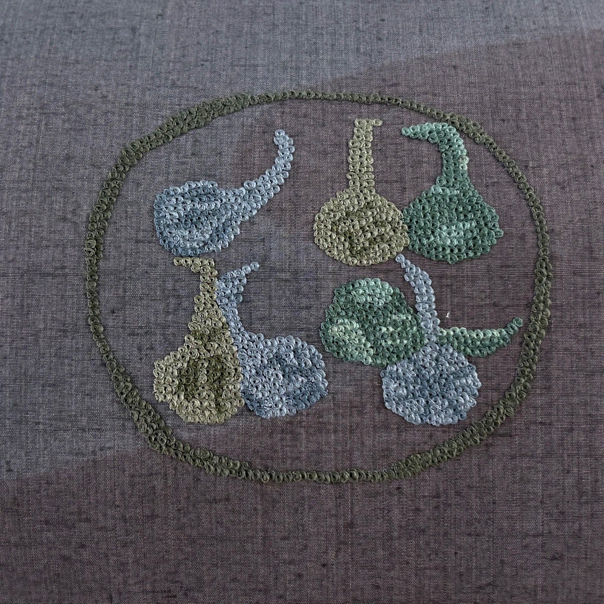 【美品】 名古屋帯 秀品 紬地 草花 雲文 刺繍 絞り 灰緑 正絹