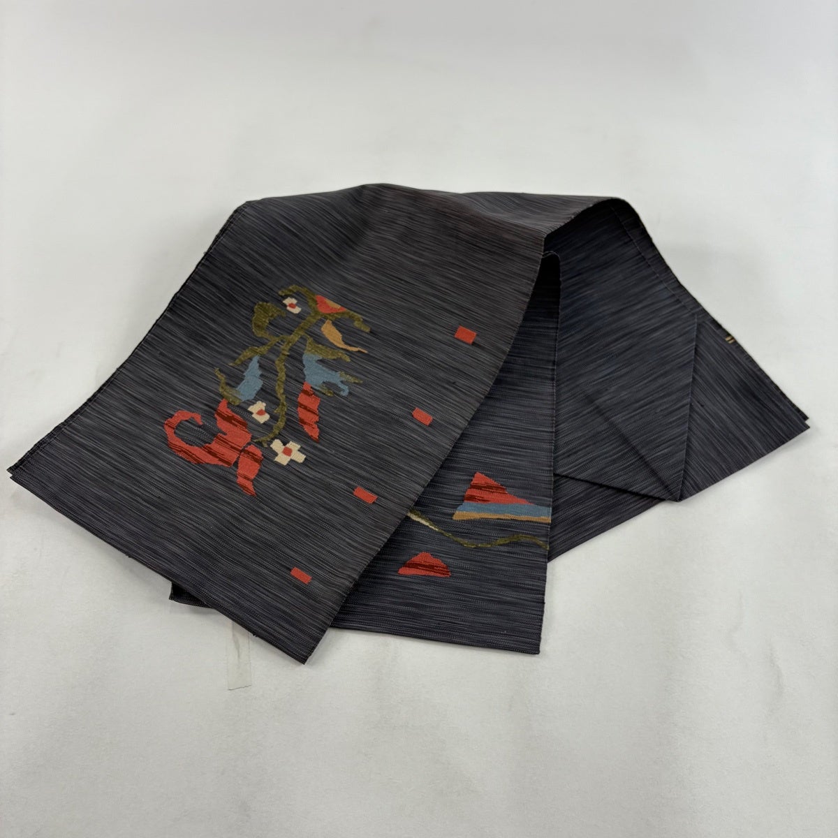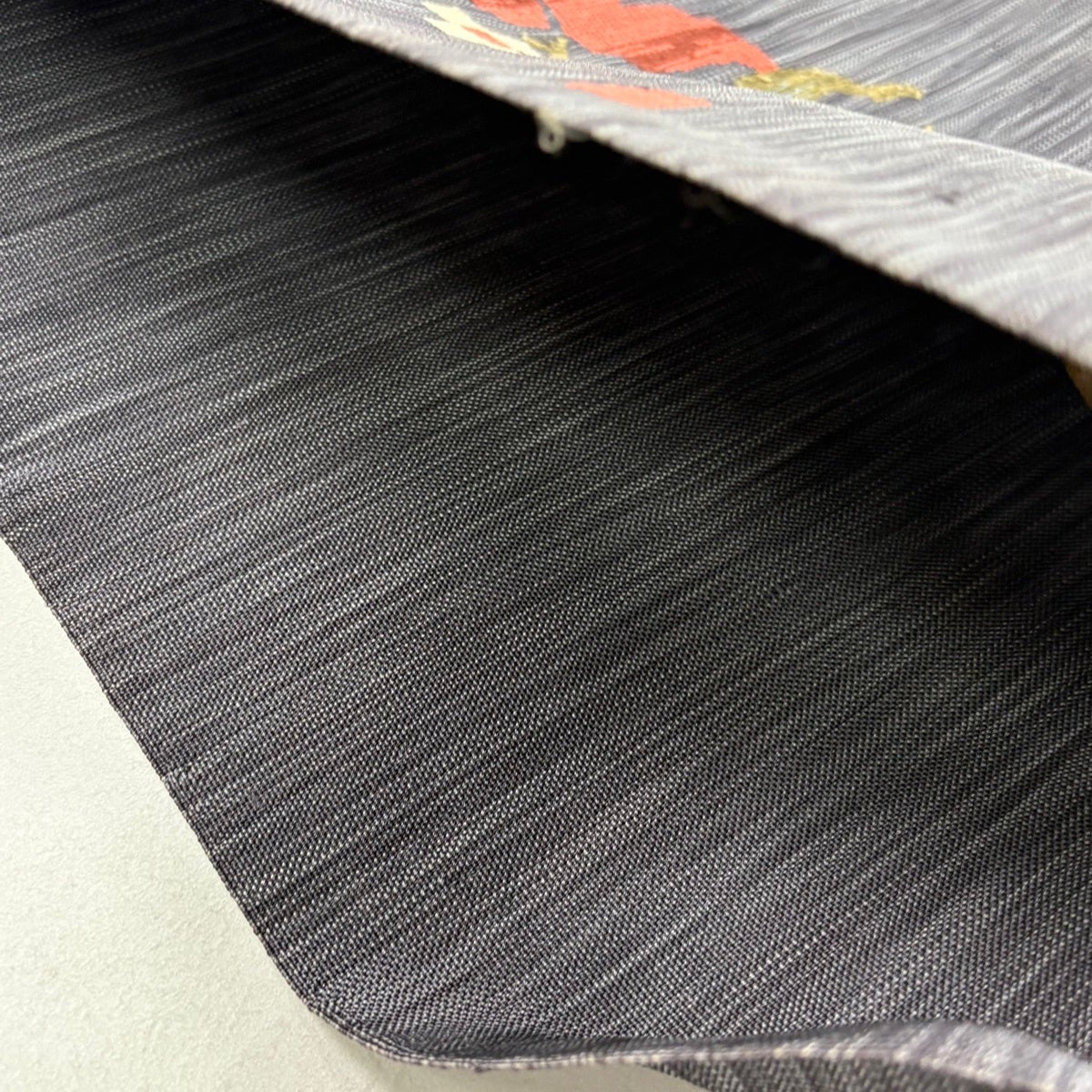 【美品】 開き名古屋帯 秀品 落款あり 吹き寄せ柄 金糸 箔 黒灰 正絹
