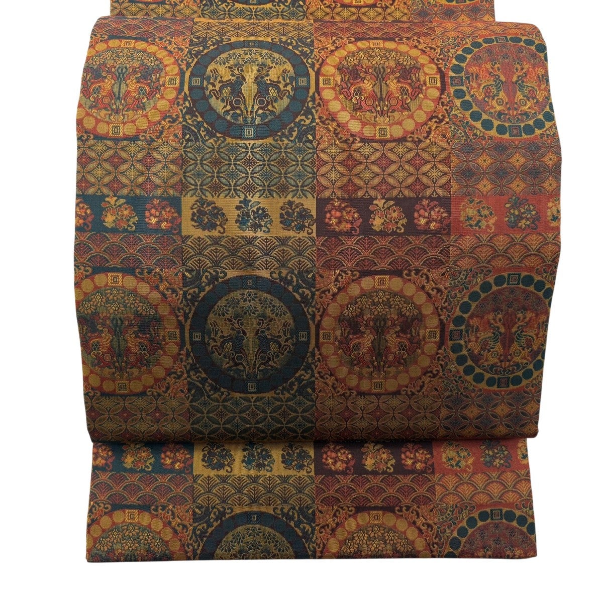 【美品】 開き名古屋帯 秀品 動物 七宝 赤茶 正絹