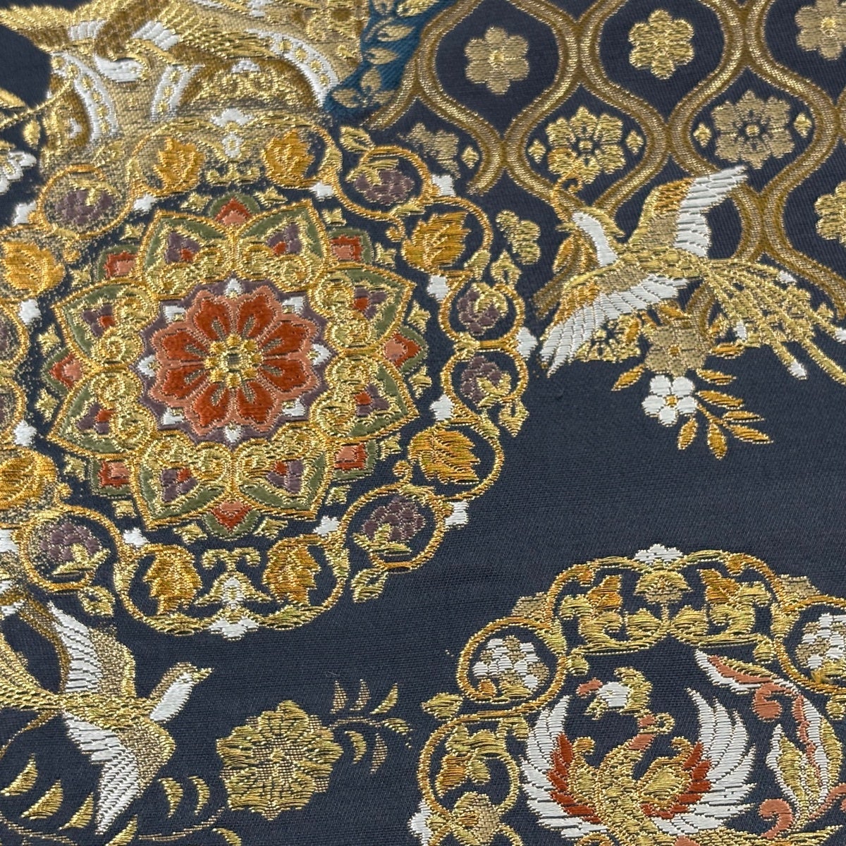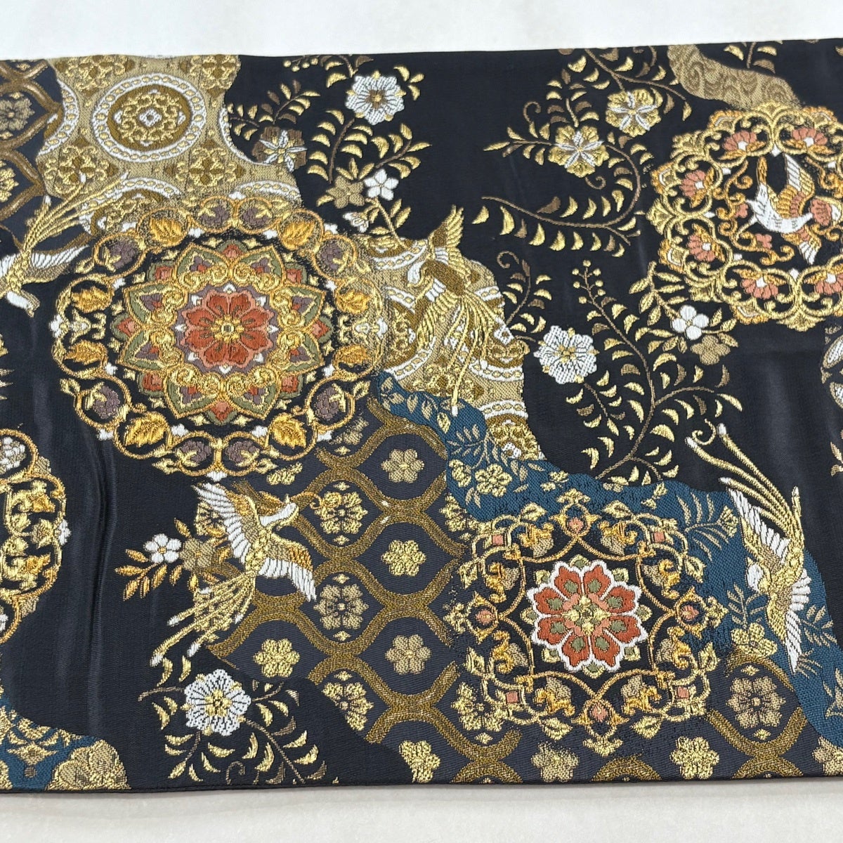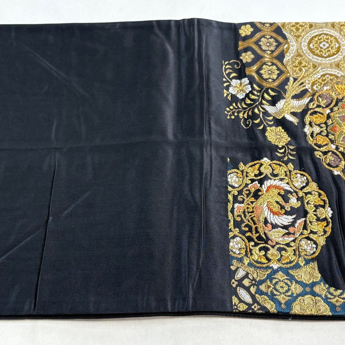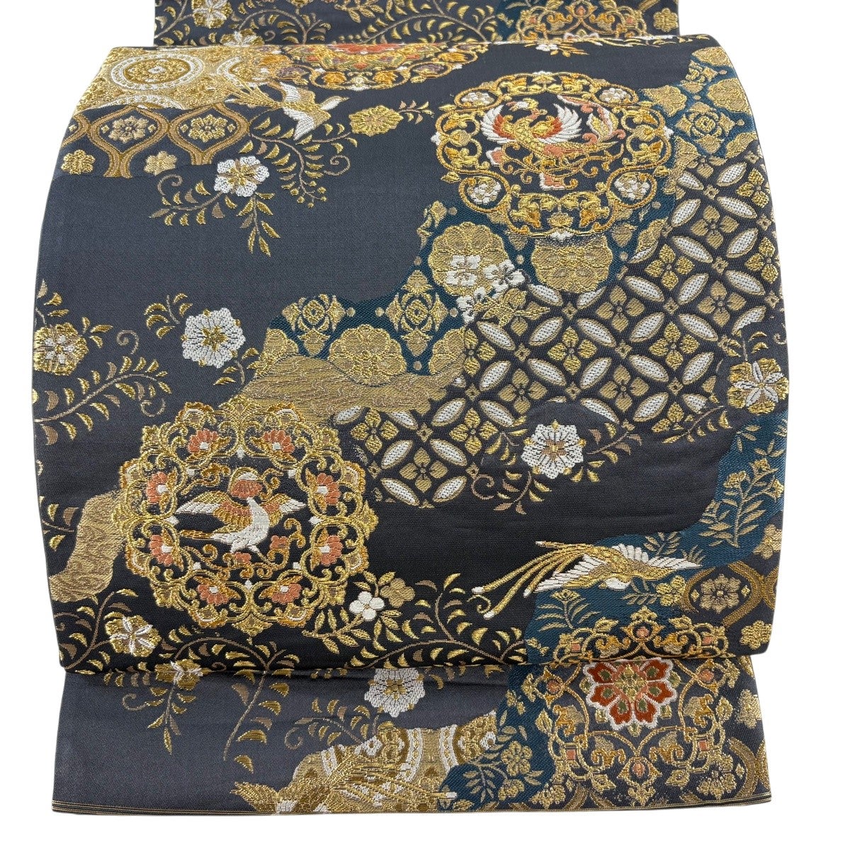 袋帯 秀品 華文 花喰い鳥 金糸 箔 墨色 六通 正絹