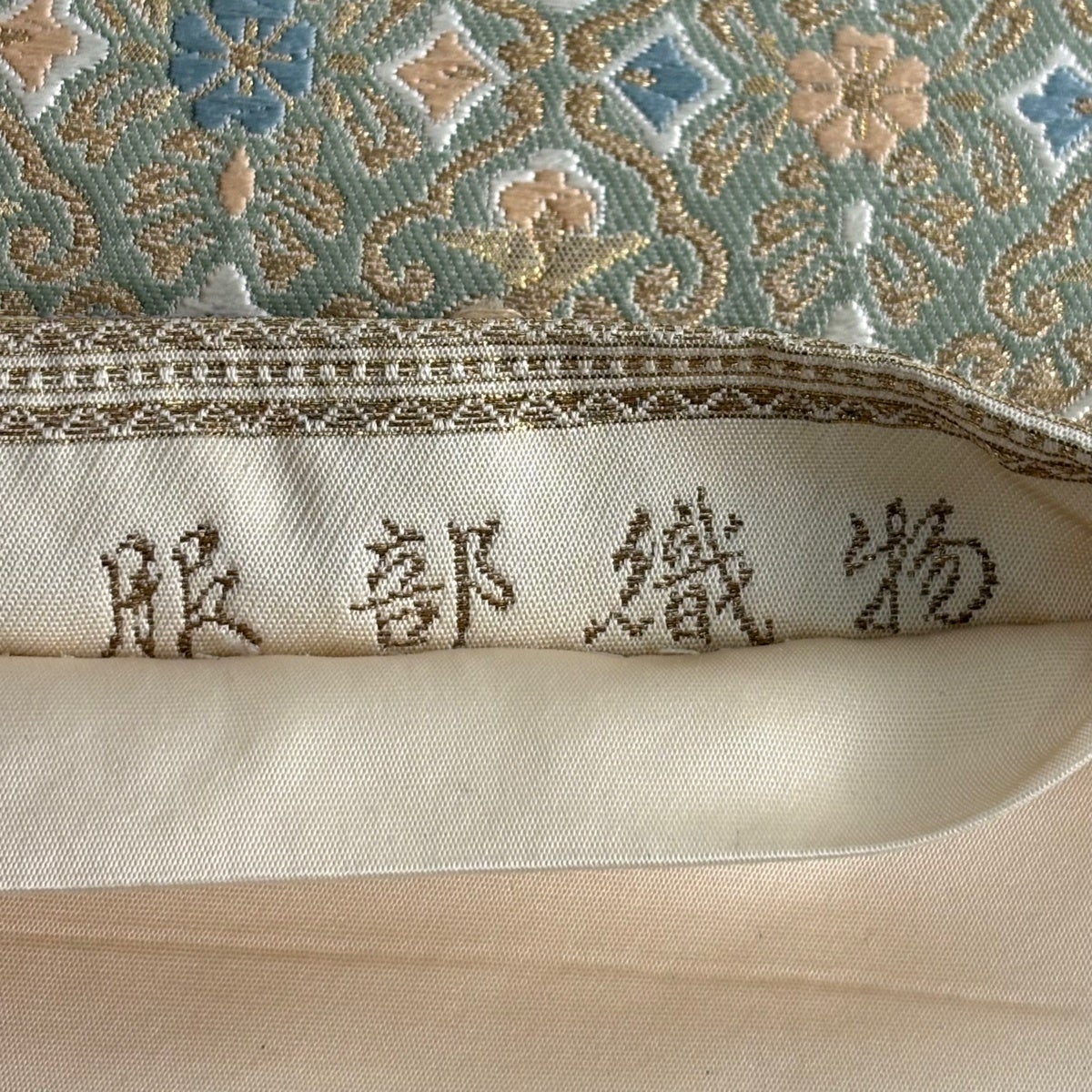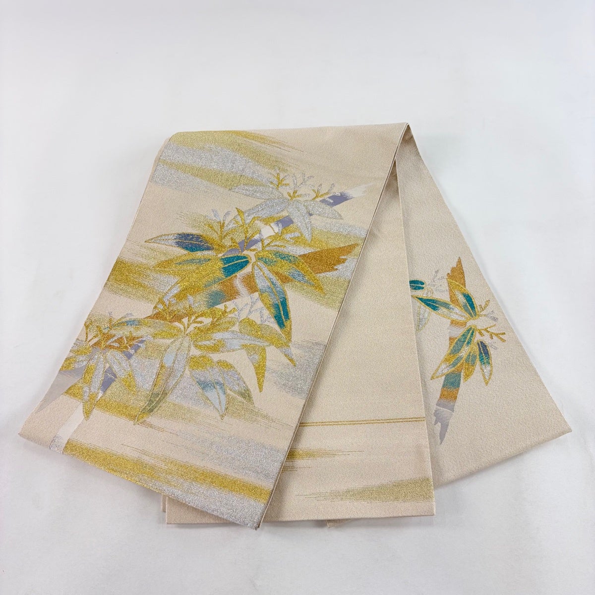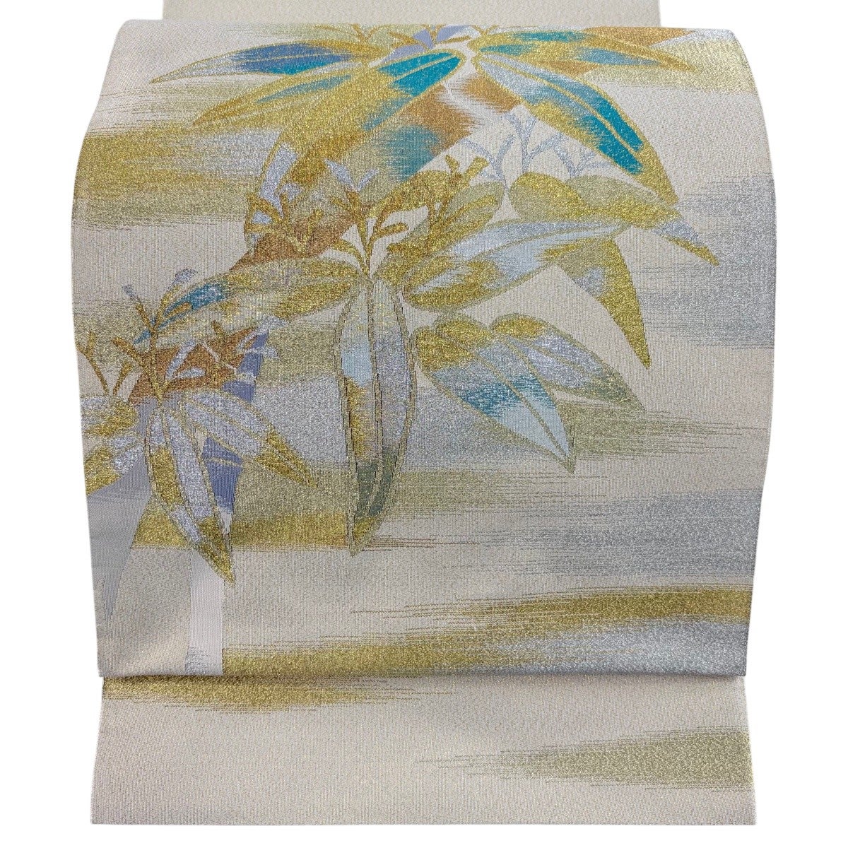 袋帯 秀品 流水波彩文 金糸 箔 銀色 六通 正絹