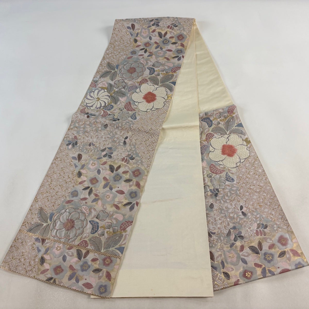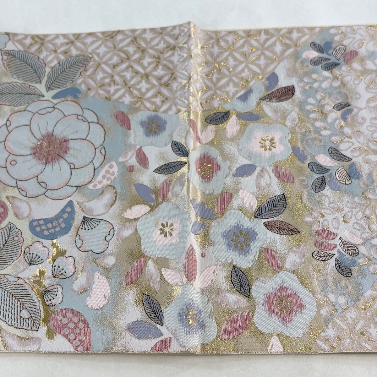 袋帯 秀品 菊 箔 金糸 ピンクベージュ 六通 正絹