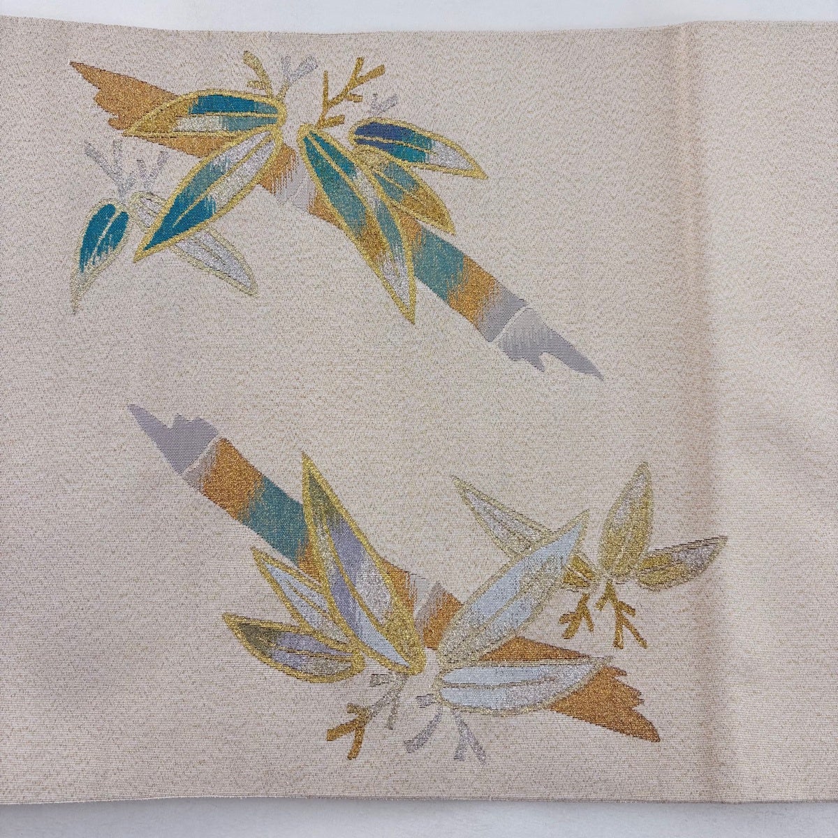 袋帯 名品 桜 葉 金銀糸 刺繍 銀色 六通 正絹