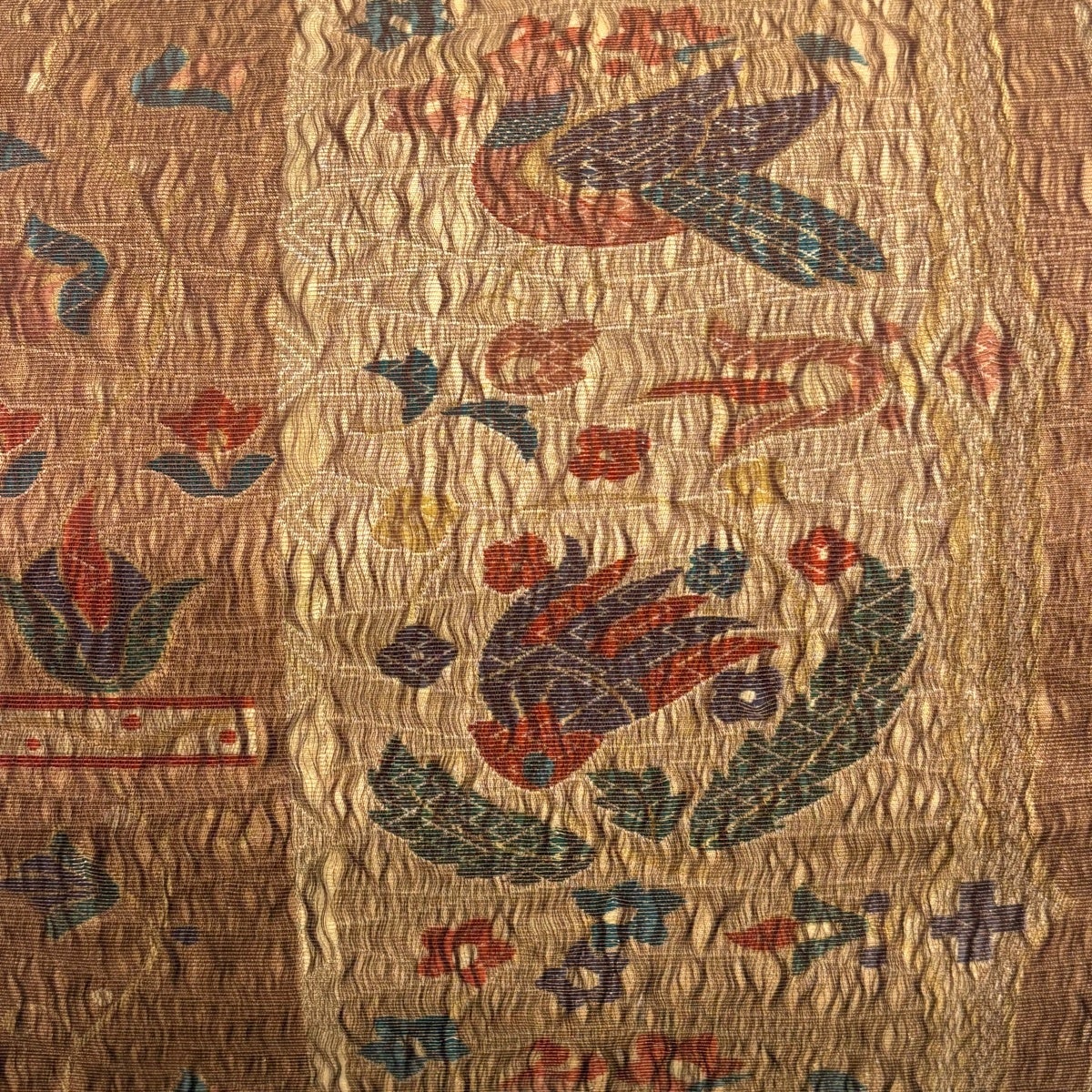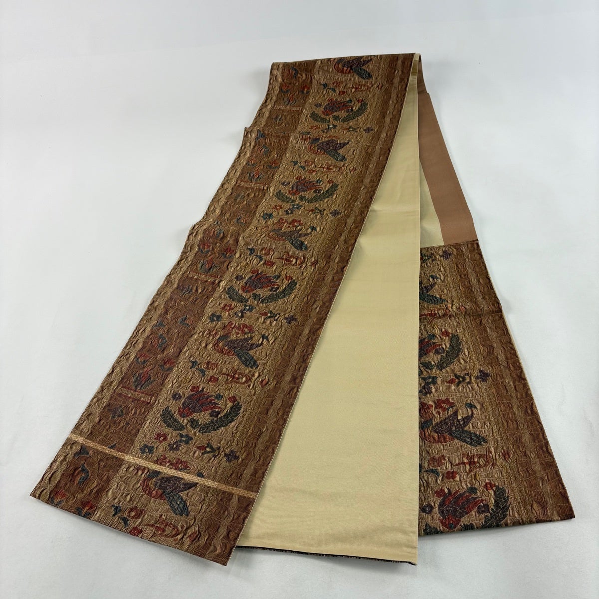 袋帯 秀品 鳥 草花 金糸 薄茶色 六通 正絹