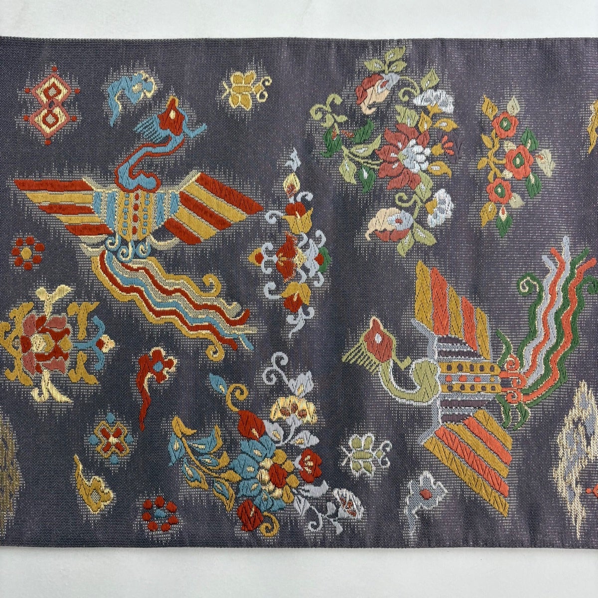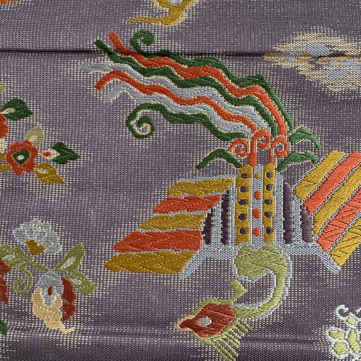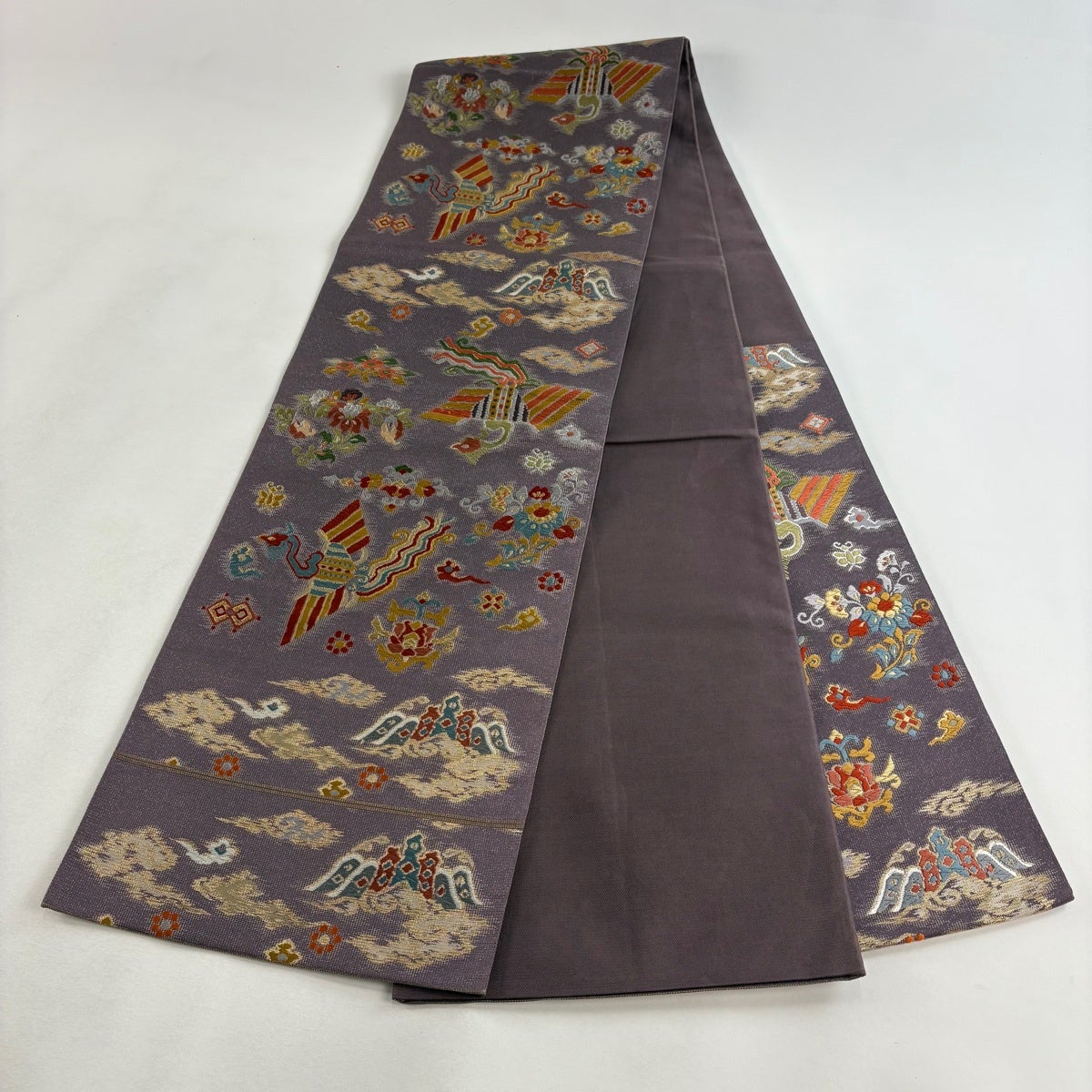 袋帯 秀品 関西仕立て 花鳥 瑞雲 唐織 箔 灰紫 六通 正絹