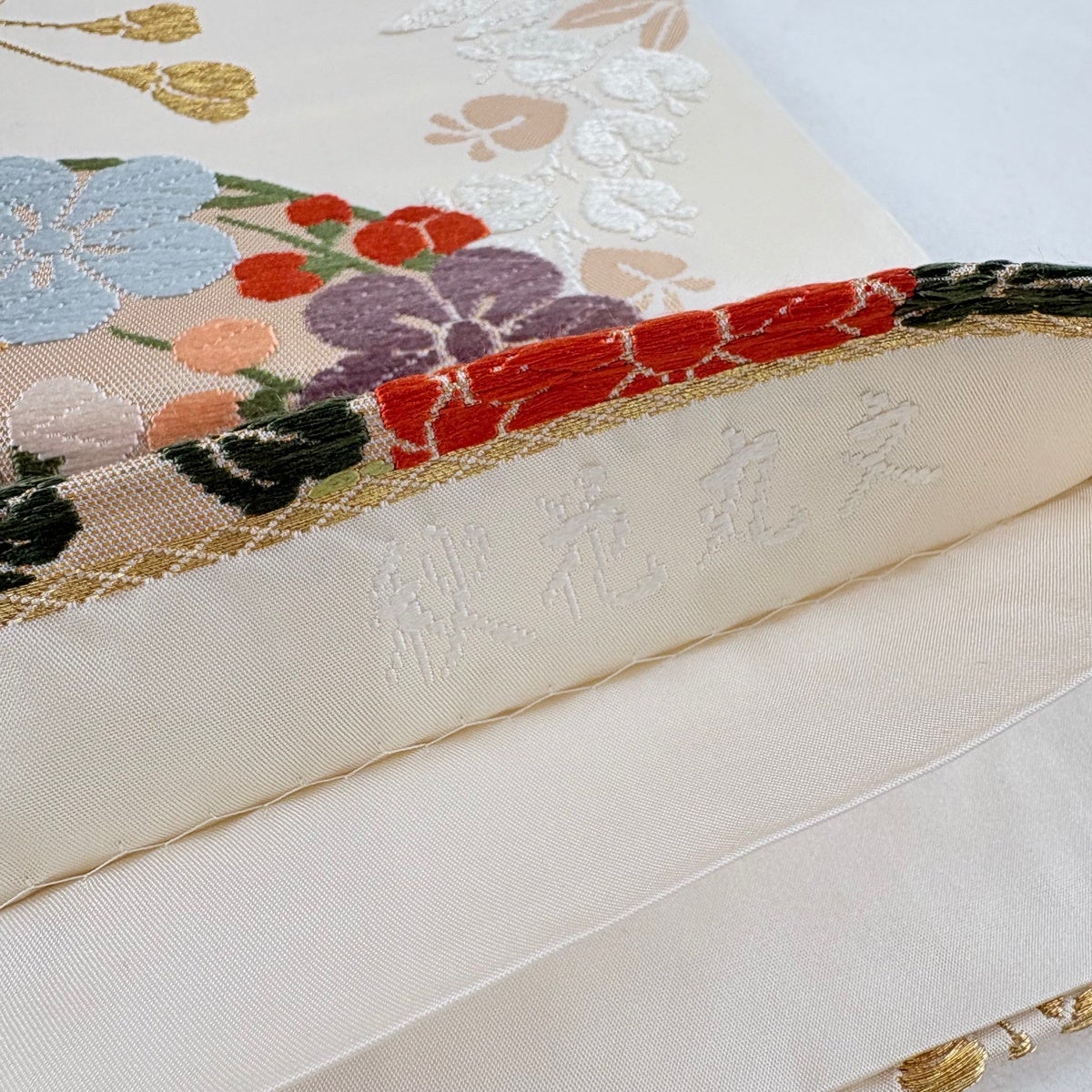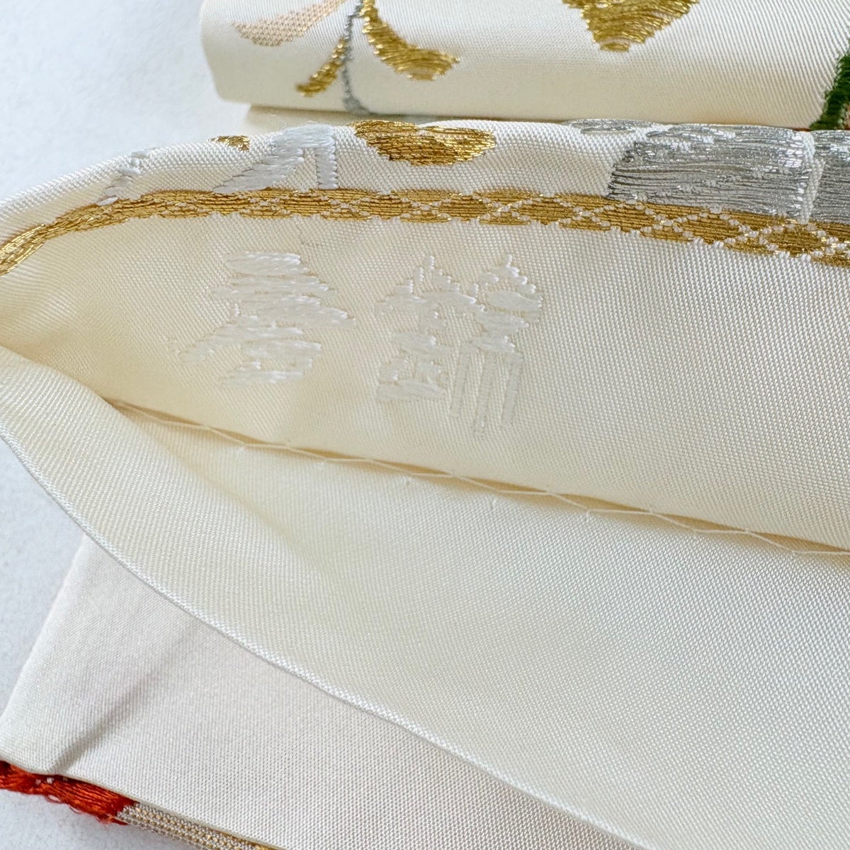 【在庫一掃】 袋帯 逸品 川島織物 落款あり 草花 七宝 唐織 箔 ベージュ 六通 正絹
