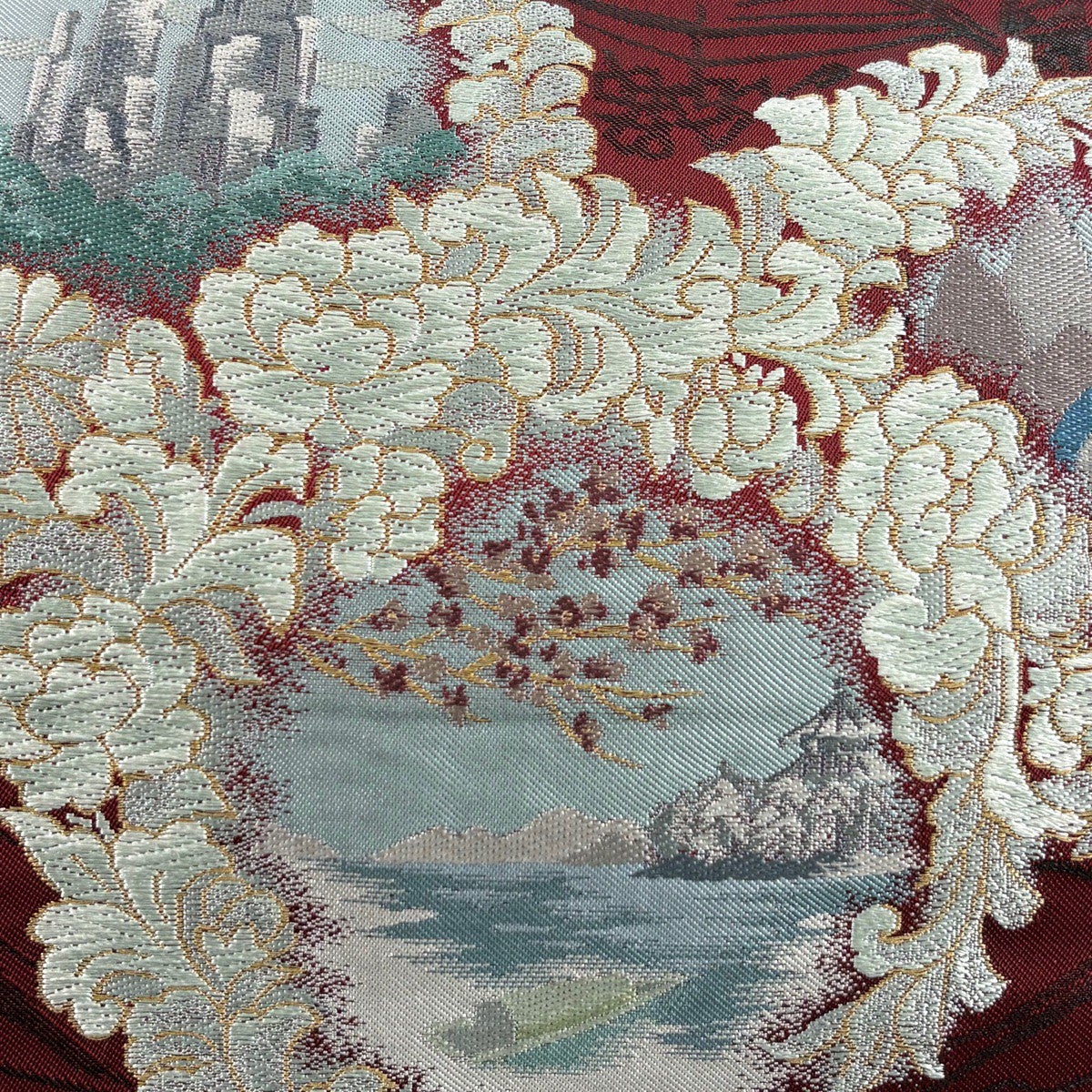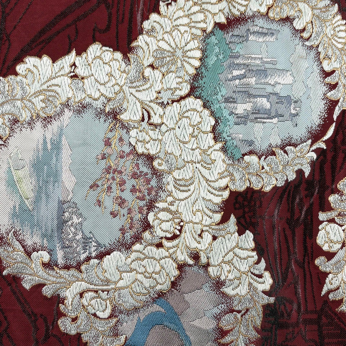 30%OFF 袋帯 名品 川島織物 落款あり 風景 花唐草 唐織 金糸 えんじ色 六通 正絹 K30