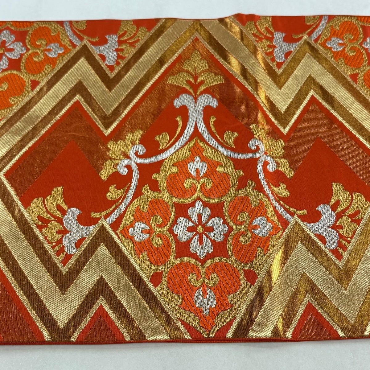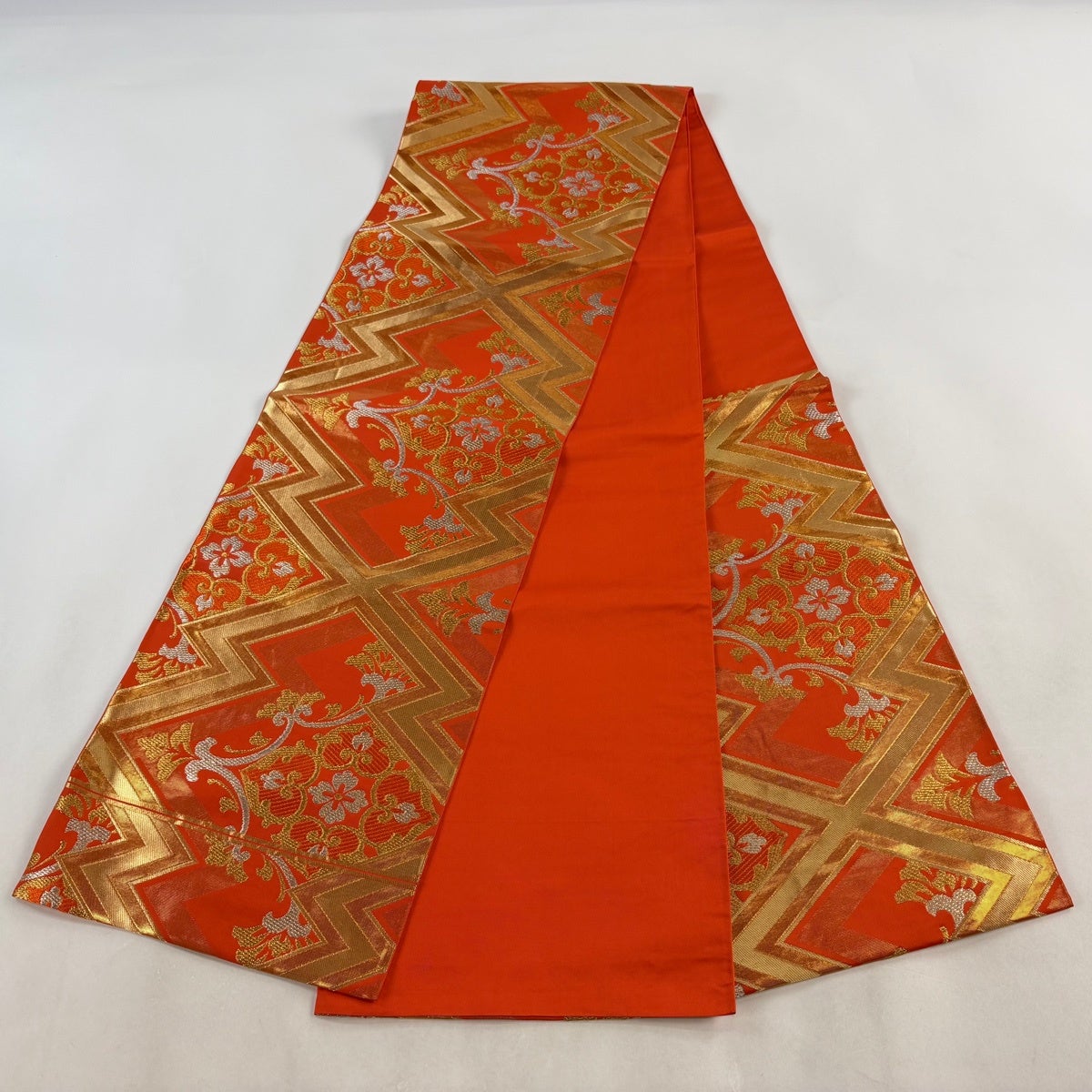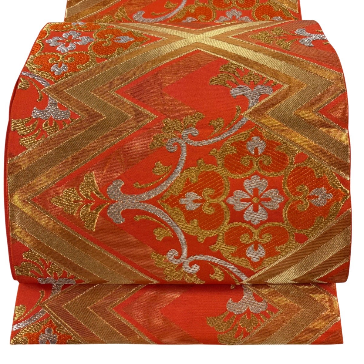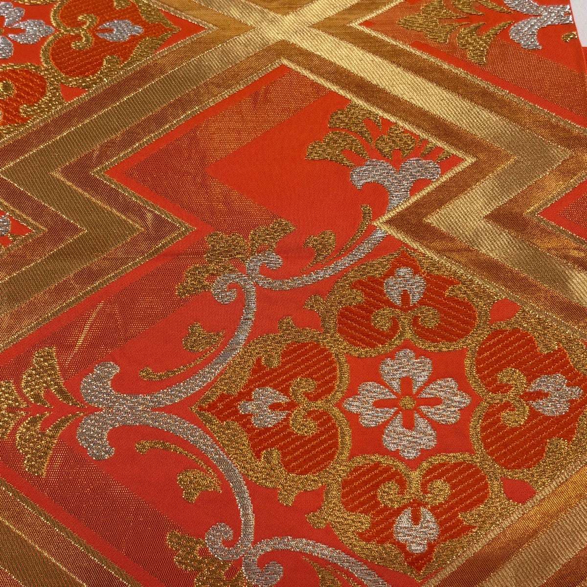 30%OFF 袋帯 秀品 川島織物 落款あり 華文 松皮菱 金銀糸 箔 オレンジ 六通 正絹 K30