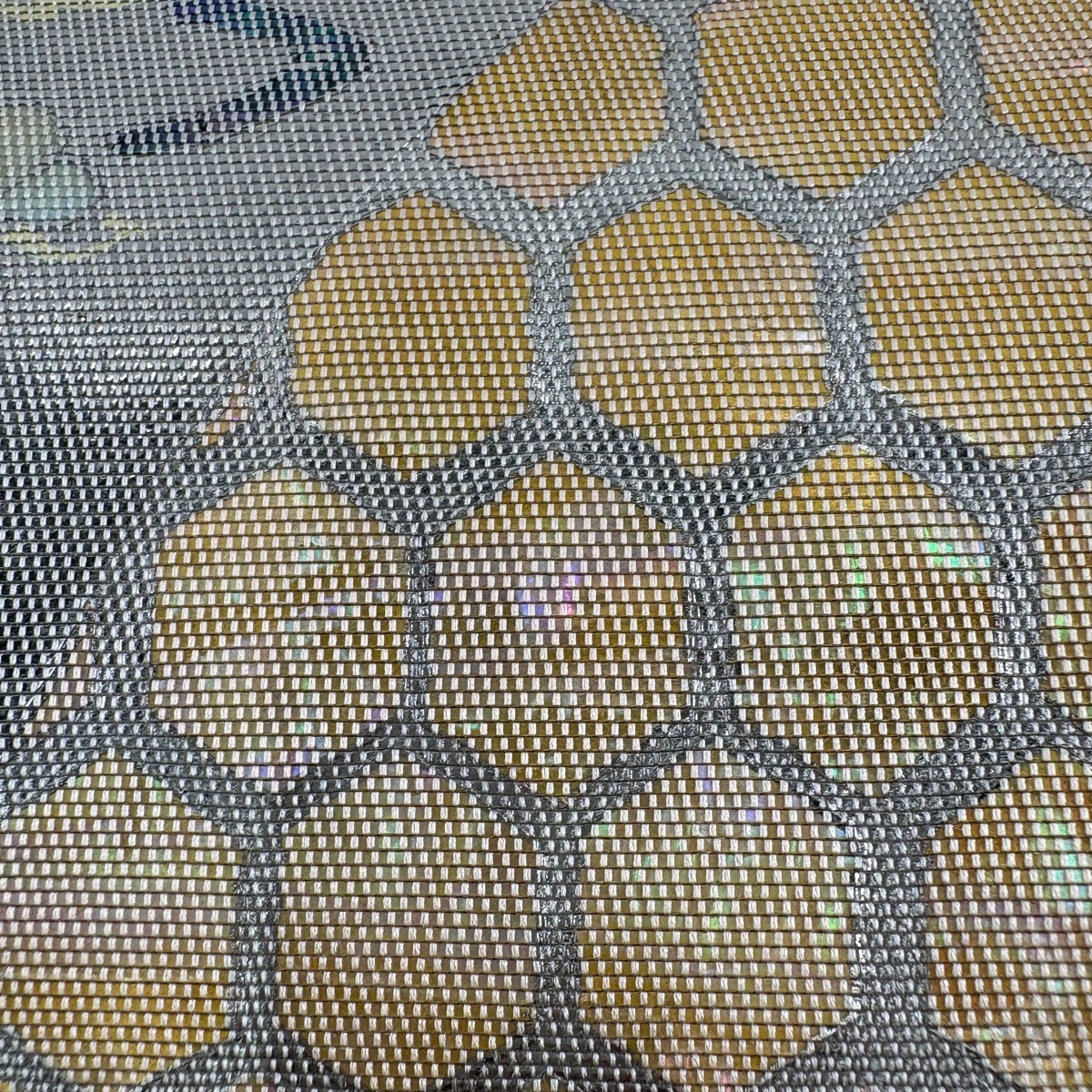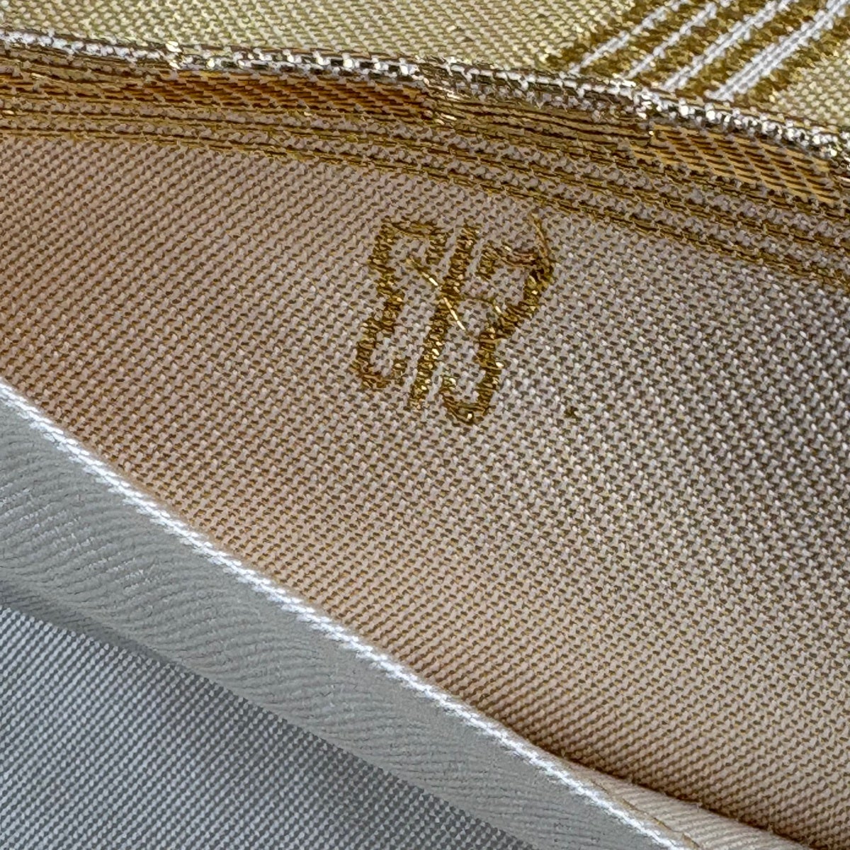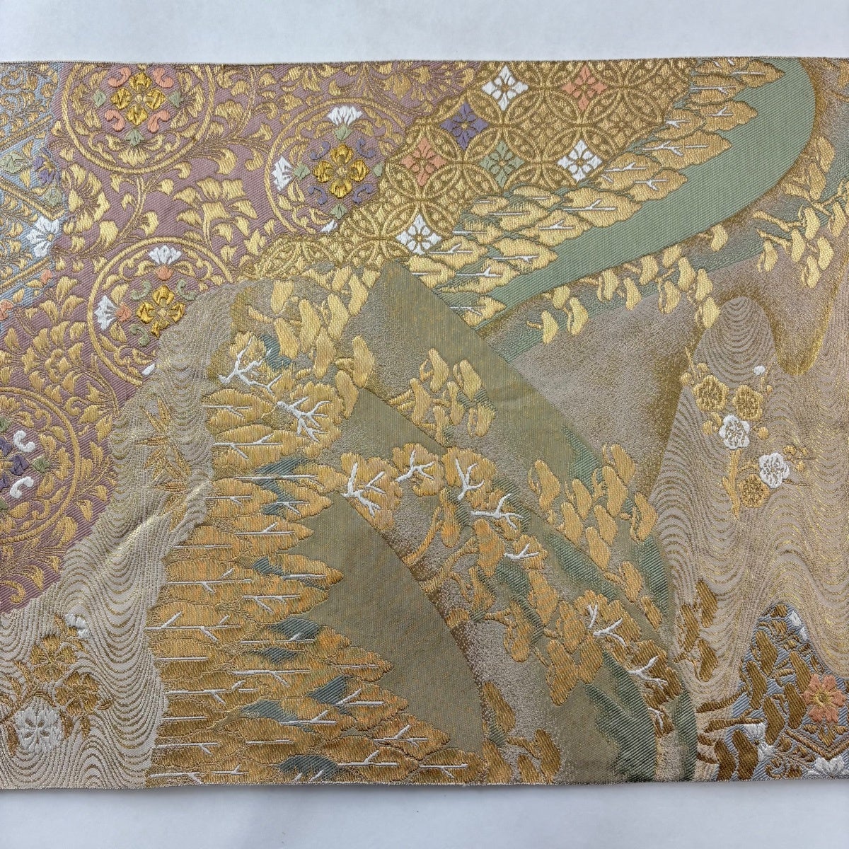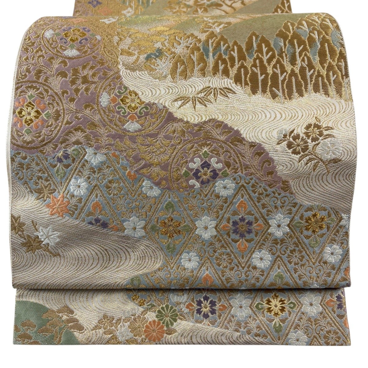 袋帯 秀品 服部織物 落款あり 風景 菱 金糸 刺繍 金色 六通 正絹