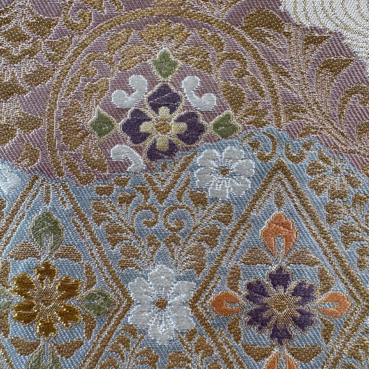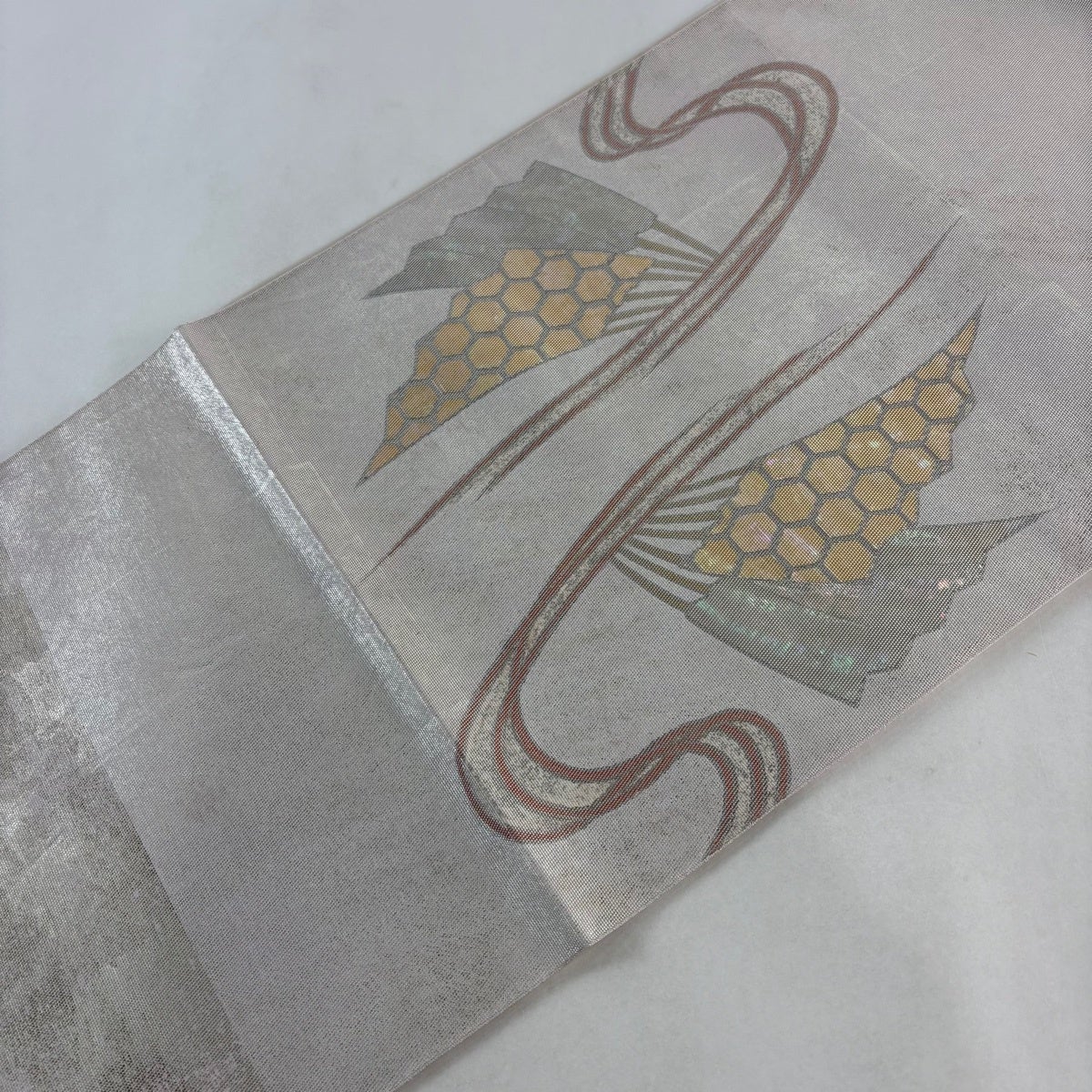 30%OFF 袋帯 秀品 関西仕立て 格天井 草花 金糸 刺繍 銀色 六通 正絹 K30