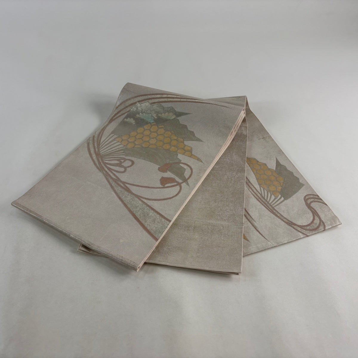 袋帯 秀品 川島織物 落款あり 関西仕立て 扇 松 箔 螺鈿箔 銀色 お太鼓柄 正絹