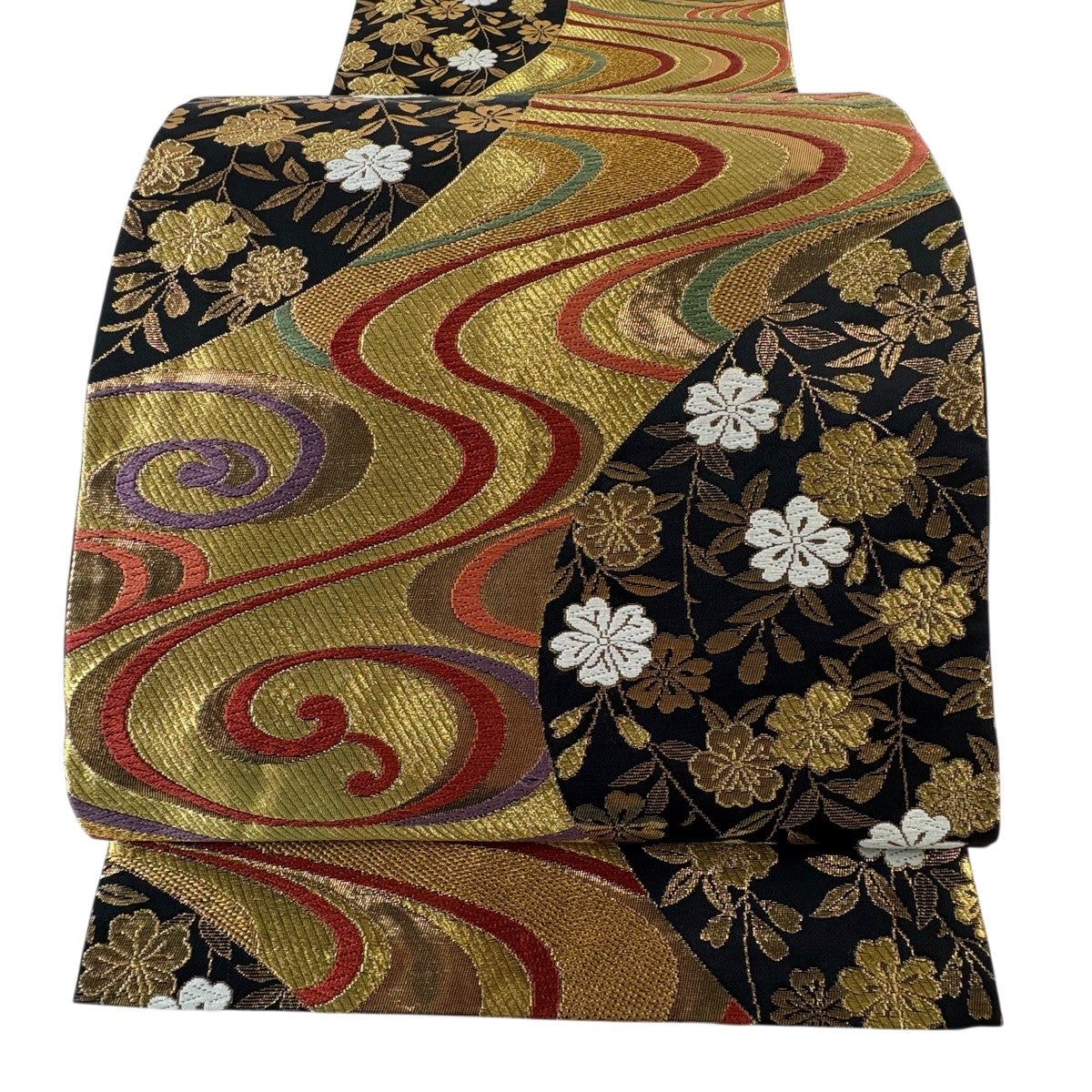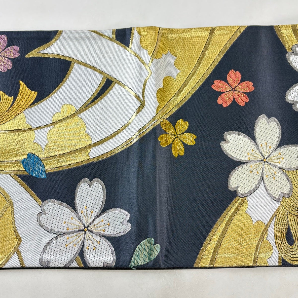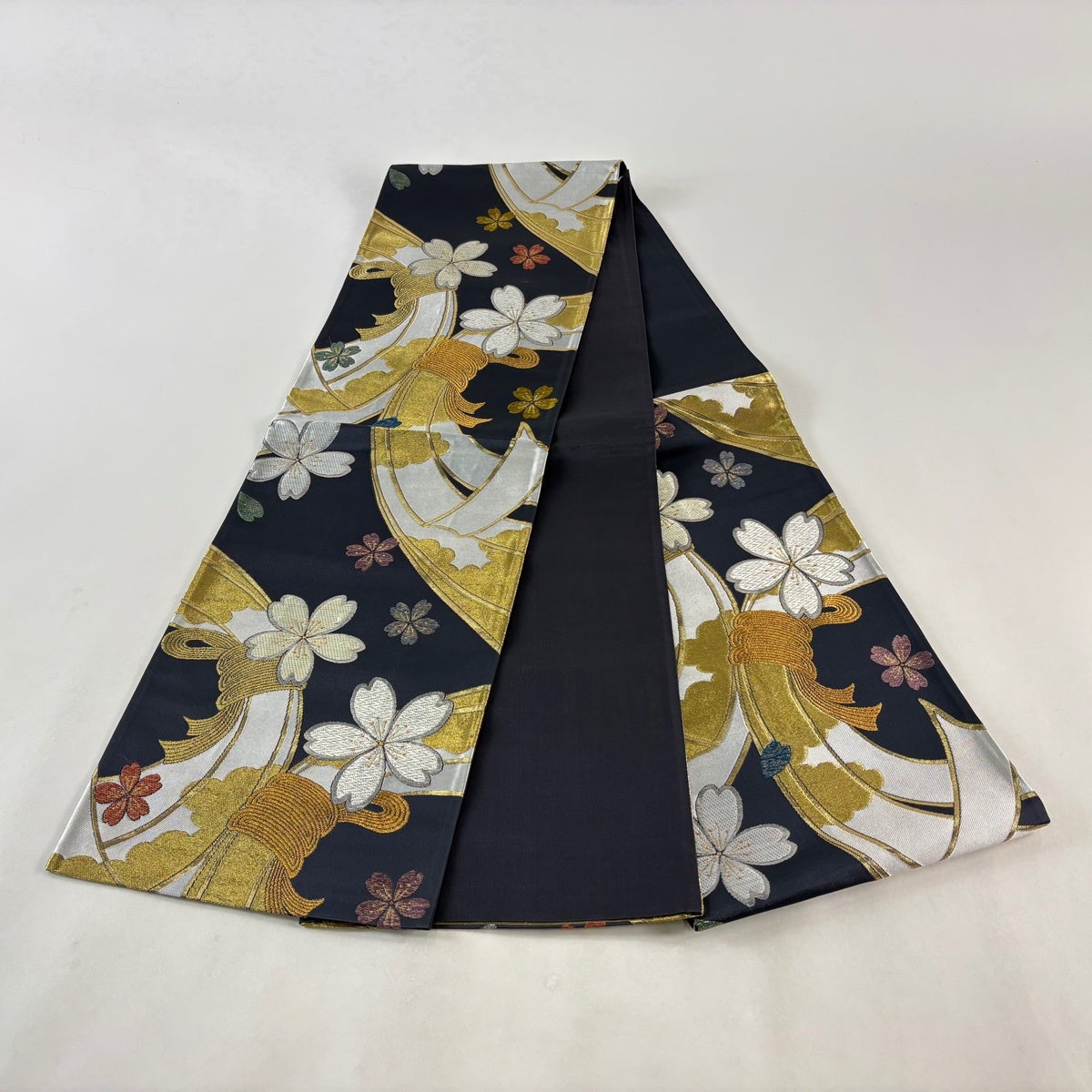 袋帯 秀品 桜 束ね熨斗 金糸 箔 墨色 六通 正絹