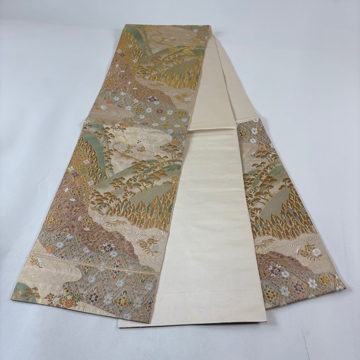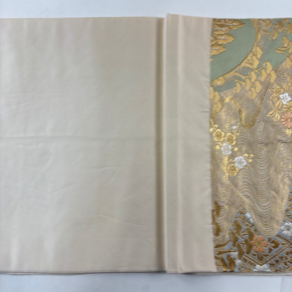50%OFF 袋帯 秀品 関西仕立て 花丸文 向かい鶴 金糸 箔 ベージュ 六通 正絹 K50